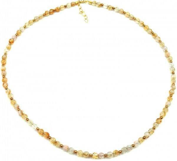 Naszyjnik wykonana ze srebra próby 925, pozłacanego 24 karatowym złotem. Kamień: Cytryn + Hematyt Rozmiar kamienia: 4/2 mm Długość: 42 cm Długości do wyboru: 38 cm /42 cm/ 44 cm Zapięcie: klasyczne (federing) Biżuteria ręcznie wykonana, produkt Polski.