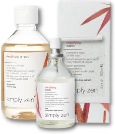 Siła natury jest niezwykła. Pozwala człowiekowi na walkę z jego niedoskonałościami. Siłę tą czerpiemy z synergii wszystkich składników zawartych w kosmetykach do pielęgnacji włosów przeciw wypadaniu włosów. Seria Simply Zen Stimulating sprawdzi się do: Zahamowania nadmiernego wypadania włosów, Zagęszczania włosów, Stymulowania ponownego wzrostu włosa, Spowalnia starzenie się skóry głowy i trzonu włosa. Najważniejsze składniki zawarte w produktach Densifying: Ekstrakt z indyjskiego drzewa Kino - najistotniejszy składnik preparatu o właściwościachłagodzących, ochronnych, przeciwzapalnych i przeciwgrzybicznych.Bogaty we flawonoidy, zwalcza wolne rodniki. Zabezpiecza przed uszkodzeniamispowodowanymi promieniowaniem UVB. Zawiera kwas glutaminowy(aminokwas niezbędny do prawidłowego funkcjonowania wielu procesów biologicznych),jak również bursztynian sodu (pobudza metabolizm komórkowy dlautrzymania optymalnej kondycji skóry głowy i włosów), Proteiny ryżowe - uzupełniają i wzmacniają włókno włosów, nadając im strukturę;kamforę - składnik pobudzający skórę głowy, zapewniający przyjemne, odświeżającei orzeźwiające doznanie. Poprawia dotlenienie skóry głowy, wspomagaprocesy komórkowe, a także pomaga utrzymać zdrowe, pełne życia włosy, Mentol o właściwościach łagodzących, odświeżających i zapachowych, Eukaliptus o właściwościach orzeźwiających i przeciwbakteryjnych, Pantenol o doskonałym działaniu nawilżającym, łagodzącym, regenerującym ikondycjonującym, Sorbitol - cukier zapobiegający utracie wilgoci. Utrzymuje cząsteczki wody napowierzchni skóry, przeciwdziałając wysuszeniu delikatnej skóry głowy i przynoszącnatychmiastową ulgę. Ekstrakty roślinne: Z aloesu uzbrojonego, litworu, tataraku, kardamonu, goździków, kurkumy,mirry, gałki muszkatołowej, czarnego pieprzu i imbiru - naturalnej mieszankio działaniu energetyzującym, pobudzającym oraz wzmacniającym, Z rozmarynu, o właściwościach ochronnych i antybakteryjnych. Bogaty w przeciwutleniacze,zwalcza wolne rodniki. Z kwiatów arniki, o delikatnym działaniu wzmacniającym i kojącym. Zestaw Simply Zen Stimulating składa się z: Z.One Simply Zen Densifying Szampon 250mlDelikatna formuła szamponu jest pozbawiona SLS i SLES zapewnia łagodne oczyszczenie i wzmocnienie włosów. Z.One Simply Zen Densifying Lotion 100mlLotion w ekonomicznej, szklanej butelce posiada niezwykle bogaty skład, który w szybkim czasie hamuje nadmierne wypadanie włosów oraz pobudza włosy do wzrostu jednocześnie zwiększając ich gęstość.