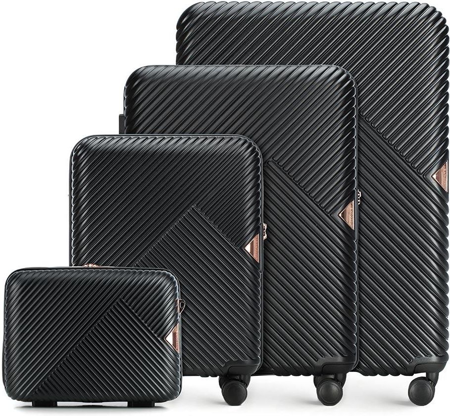 Komplet walizek z kolekcji GL Style Walizki stworzone z polikarbonu z wykończeniem matowym. To designerski projekt z lśniącymi okuciami w kolorze różowego złota. Kółka wykonane z tworzywa sztucznego ABS z elastyczną powłoką. Wnętrze bagażu pokrywa beżowa podszewka z logo WITTCHEN. Model dostępny w trzech odcieniach: białym, czarnym oraz różowym. Nasza rada: gra kontrastów oraz geometryczne wzornictwo zadowolą kobiety podążające za bieżącymi trendami w modzie. wyposażone w cztery podwójne kółka ułatwiające manewrowanie; wysuwany uchwyt oraz gumową rączkę ułatwiającą przenoszenie bagażu; system TSA, bardzo przydatny w przypadku rewizji bagażu przez służby celne - gwarantuje on bezinwazyjne otwarcie walizki oraz jej ponowne zamknięcie, bez uszkodzenia zamka; komora główna z regulowanymi pasami zabezpieczającymi ubrania przed przemieszczaniem; kieszeń zamykana na suwak; dwie kieszenie z siatki zamykane na suwak; komora zamykana na suwak. W skład kompletu wchodzą: Kosmetyczka 56-3P-844 Mała walizka na kółkach 56-3P-841 Średnia walizka na kółkach 56-3P-842 Duża walizka na kółkach 56-3P-843 Podane wymiary obejmują również elementy wystające, takie jak rączki czy kółka.