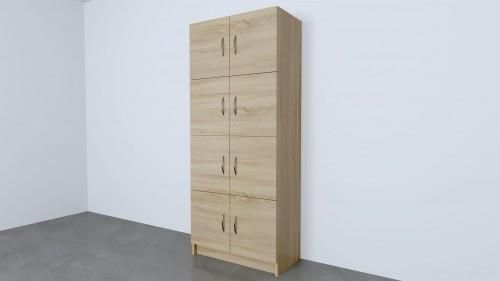 Szafa wykonana z płyty meblowej o grubości 18 mm; zamknięta 4 półki, z których każda zamykana jest podwójnymi drzwiami Wymiary wysokość: 190 cm szerokość: 80 cm głębokość: 40 cm Dostępna w różnych kolorach.