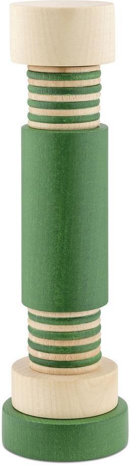 Młynek do soli, pieprzu i przypraw o cylindrycznym korpusie wykonanym z drewna bukowego, naturalny- zielony. Matowe lakiernicze wykończenie, ceramiczny mechanizm mielący. Ceramiczny mechanizm mielący gwarantuje dużą wszechstronność zastosowania, idealny do mielenia nawet bardzo twardych przypraw, np. kryształków soli. Dwie wypustki na podstawie młynka do pieprzu umożliwiają regulację stopnia zmielenia. Wyprodukowany z drewna posiadającego certyfikat FSC, gwarantujące pochodzenie ekologiczne. Malowane farbami na bazie wody, które są trwałe dla środowiska i nieszkodliwe dla zdrowia ludzkiego, całkowicie niezawierającymi rozpuszczalników. Poszerzając kolekcję „domowych totemów” Ettore Sottsassa, ten młynek do pieprzu stworzony przez projektanta w 1989 roku powraca do katalogu Alessi ze wszystkimi współczesnościami i esencją jego niepowtarzalnego stylu. -Łatwy do czyszczenia- Użyj wilgotnej szmatki lub środka do czyszczenia drewna i natychmiast wysusz. Nie myj przez zanurzenie, pod bierzącą wodą lub w zmywarce i unikaj stosowania środków ściernych, detergentów, które mogłyby uszkodzić wykończenie powierzchni produktu. Nie wystawiaj na długotrwałe działanie światła słonecznego lub ciepła, przechowuj w suchym i wentylowanym miejscu. Średnica: 7 cm Wysokość: 25,5 cm Waga: 0.550 Kg