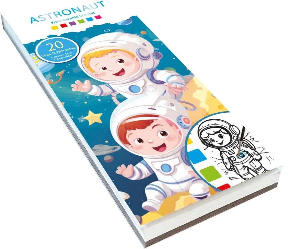 Kolorowanka wodna AUSTRONAUCI, wymiary 8x18,8cm (z opak. 8x23,8cm), 20 stron, w zestawie farby i pędzelek