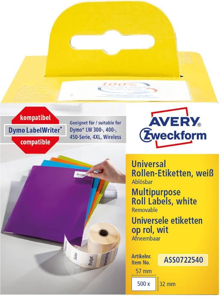 ETYKIETY UNIWERSALNE W ROLCE 32 X 57 MM BIAŁE DO DRUKAREK TERMICZNYCH ASS0722540 AVERY ZWECKFORM Usuwalne etykiety uniwersalne Avery Zweckform w rolce do drukarek termicznych. Gwarancja niezawodnego zadruku i pewnego przylegania etykiety, a jednocześnie są łatwe do usunięcia bez pozostawiania śladów kleju. Małe, ekonomiczne opakowanie, z mniejszą ilością etykiet na rolce, idealne dla osób z niewielkim zapotrzebowaniem na ten rodzaj etykiety. Rozmiar: 32 x 57 mm. Klej: usuwalny. 1 rolka/op. Kolor: białe. Ilość etykiet/opakowanie: 500 Są w 100% kompatybilne z Dymo LW330T LW400 Seria LW450 Seria Brother TD-4100N Avery Zweckform oferuje gotowe rozwiązania dla osób szukających wszelkiego rodzaju etykiet i oznaczeń. Skorzystaj z gotowych produktów AVERY Zweckform lub dostosuj je dokładnie do swoich potrzeb. Firma oferuje materiały i narzędzia, które pomogą Ci stworzyć etykiety i oznaczenia przemysłowe oraz logistyczne. Prowadzisz małą firmę? Wśród produktów marki AVERY znajdziesz prawie wszystko, czego potrzebujesz do reklamy i etykietowania produktów.