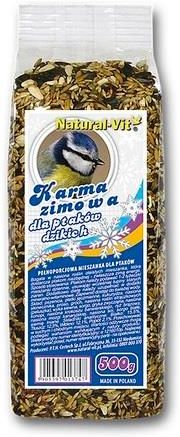 Karma zimowa ziarnowa 500g Skład przenica płatki jęczmienne kukurydza nasiona słonecznika proso groch nasiona roslin strączkowych wyka siewna sorgo gryka zwyczajna nasiona konopi nasiona krokoszu bawarskiego ryż brązowy nasiona soi sorgo białę siemie lniane Doskonały posiłek dla ptaków zimujących dziko- żyjących. Ptakom należy podawać 1-2 łyżeczki dziennie. Usuwać wcześniej łupiny starych ziaren. Dietę należy usupełniaćw dodatki mineralno-witaminowe. Zapewnić dostep do świeżej wody. NATURAL-VIT to karma zimowa bogata w nasiona roślin oleistych dostarcza ptakom niezbędnej – zwłaszcza zimom energii. Skomponowana z surowców najwyższej jakości zapewnia ptakom kompletne i dobrze zbilansowane pożywienie