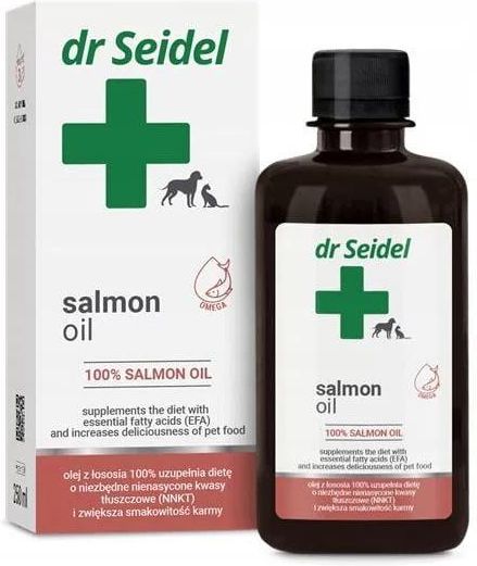 Dr Seidel Salmon Oil to w 100% naturalny olej z łososia, będący bogatym źródłem niezbędnych nienasyconych kwasów tłuszczowych (NNKT) omega-3. Ten wyjątkowy suplement wspiera zdrowie skóry i sierści, poprawiając ich kondycję, elastyczność i blask. Olej łososiowy, dzięki swoim właściwościom może pomagać przeciwzapalnie, pomaga łagodzić podrażnienia skóry i wspiera regenerację opuszek łap. Produkt polecany jest zarówno dla psów, jak i kotów, niezależnie od ich wieku, a także w szczególnych okresach, takich jak ciąża czy laktacja. Dodatkowo, podawany z karmą, zwiększa smakowitość posiłków, co czyni go idealnym rozwiązaniem dla zwierząt wybrednych. Dr Seidel Salmon Oil – naturalne wsparcie procesów metabolicznych i odporności Dr Seidel Salmon Oil to nie tylko produkt poprawiający kondycję skóry i sierści, ale także suplement wspierający procesy metaboliczne i odpornościowe. Kwasy tłuszczowe omega-3, zawarte w oleju z łososia, pomagają zmniejszać stany zapalne, wspierają zdrowie układu sercowo-naczyniowego oraz wzmacniają naturalną odporność organizmu. Dzięki swojemu kompleksowemu działaniu produkt jest odpowiedni zarówno dla szczeniąt, dorosłych psów, kotów, jak i zwierząt starszych. Jego regularne stosowanie może wpłynąć na poprawę apetytu oraz ogólnego samopoczucia Twojego pupila. Kluczowe korzyści zdrowotne Poprawa kondycji skóry i sierści: Omega-3 wspiera regenerację skóry, nadając sierści blask i elastyczność. Wsparcie procesów metabolicznych: Wzmacnia odporność i wspiera prawidłowe funkcje metaboliczne. Poprawa apetytu: Podawany z karmą zwiększa smakowitość posiłków, zachęcając zwierzę do jedzenia. Kiedy warto rozpocząć stosowanie Dr Seidel Salmon Oil? Stosowanie Dr Seidel Salmon Oil jest zalecane w każdej fazie życia zwierzęcia, szczególnie w przypadku problemów z kondycją skóry i sierści, takich jak suchość, łamliwość czy nadmierne linienie. Produkt sprawdzi się również u zwierząt zmagających się ze stanami zapalnymi, obniżoną odpornością czy zmniejszonym apetytem. Olej jest także polecany dla suk i kotek w okresie ciąży oraz laktacji, wspierając ich zdrowie i regenerację organizmu. Dlaczego warto kupić Dr Seidel Salmon Oil? Dr Seidel Salmon Oil to w 100% naturalny olej z łososia, który dostarcza niezbędnych składników wspierających zdrowie skóry, sierści i organizmu Twojego pupila. Dzięki wysokiej zawartości kwasów omega-3 działa przeciwzapalnie i wspiera procesy metaboliczne, poprawiając ogólną kondycję zwierzęcia. Olej zwiększa smakowitość posiłków, co jest szczególnie istotne dla zwierząt wybrednych. Produkt można stosować zarówno profilaktycznie, jak i w celu łagodzenia istniejących problemów zdrowotnych. Jego łatwe podawanie wraz z karmą czyni go wygodnym wyborem dla każdego właściciela. Ciekawostka na temat omega-3 Kwasy tłuszczowe omega-3, zawarte w Dr Seidel Salmon Oil, mają potwierdzone działanie wspierające odporność. Badania pokazują, że regularne suplementowanie omega-3 może zmniejszyć ryzyko wystąpienia chorób zapalnych skóry oraz poprawić funkcje poznawcze u starszych zwierząt. Dzięki swoim wszechstronnym właściwościom omega-3 są jednym z najważniejszych składników diety psów i kotów.