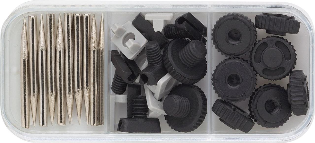 Elementy zapasowe do cyrkliPudełko z częściami zamiennymi do cyrkli Faber-Castell. Umieszczone w praktycznym, plastikowym pudełku. Zestaw zawiera igły, śruby, uchwyty regulujące rysik. W zestawie igły, śruby, uchwyty regulujące rysik