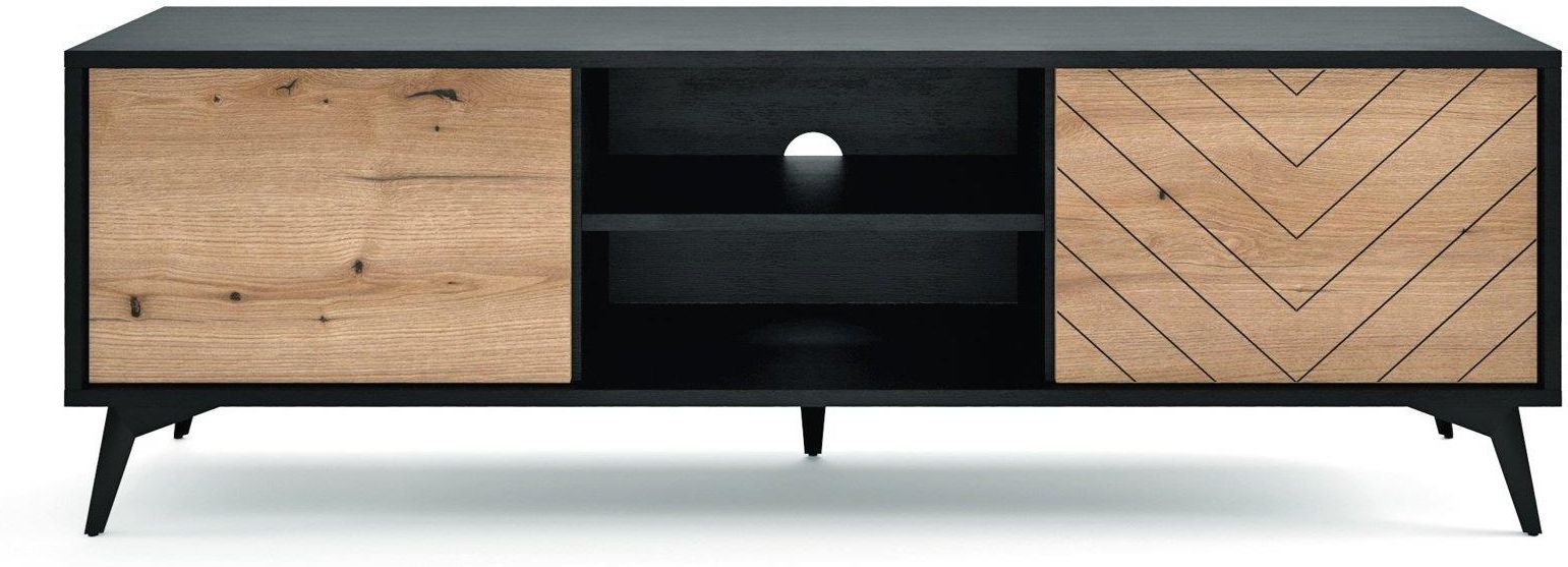 Szafka RTV Brego w jodełkę Loftowa szafka RTV Brego to idealne połączenie nowoczesnego designu i funkcjonalności. Wyposażona w elegancki front w jodełkę oraz solidny czarny korpus, z pewnością stanie się centralnym punktem Twojego salonu lub sypialni. Wykonana z wytrzymałej płyty meblowej, łączy styl i praktyczność. ✅ Szafka RTV na wysokich nóżkach ✅ Front w elegancką jodełkę ✅ Korpus w klasycznym kolorze czarnym ✅ Fronty w naturalnym kolorze dębu z frezowaniem ✅ Funkcja push to open – łatwe otwieranie przez naciśnięcie ✅ Otwór na przewody RTV – porządek w kablach ✅ Metalowe nogi o zwężającej się budowie ✅ Przeznaczona do salonu oraz sypialni ✅ Maksymalna przekątna urządzenia: 70 cali Stwórz wyjątkowe miejsce w swoim wnętrzu! Wysokość (cm): 50 Szerokość (cm): 154 Głębokość (cm): 39 Kolor: brązowy, czarny Kolor:: naturalny dąb Kolor podstawy: czarny Front: w jodełkę Ilość szafek: 2 Rodzaj podstawy: 4 nogi Materiał blatu: płyta meblowa Materiał: płyta meblowa, metal Wymaga montażu: tak Materiał podstawy: metal Funkcje/cechy: otwór na przewód RTV, push to open AX-sem: to do Pomieszczenie: salon, sypialnia Styl: loftowy, nowoczesny Maksymalna przekątna urządzenia w calach: 70