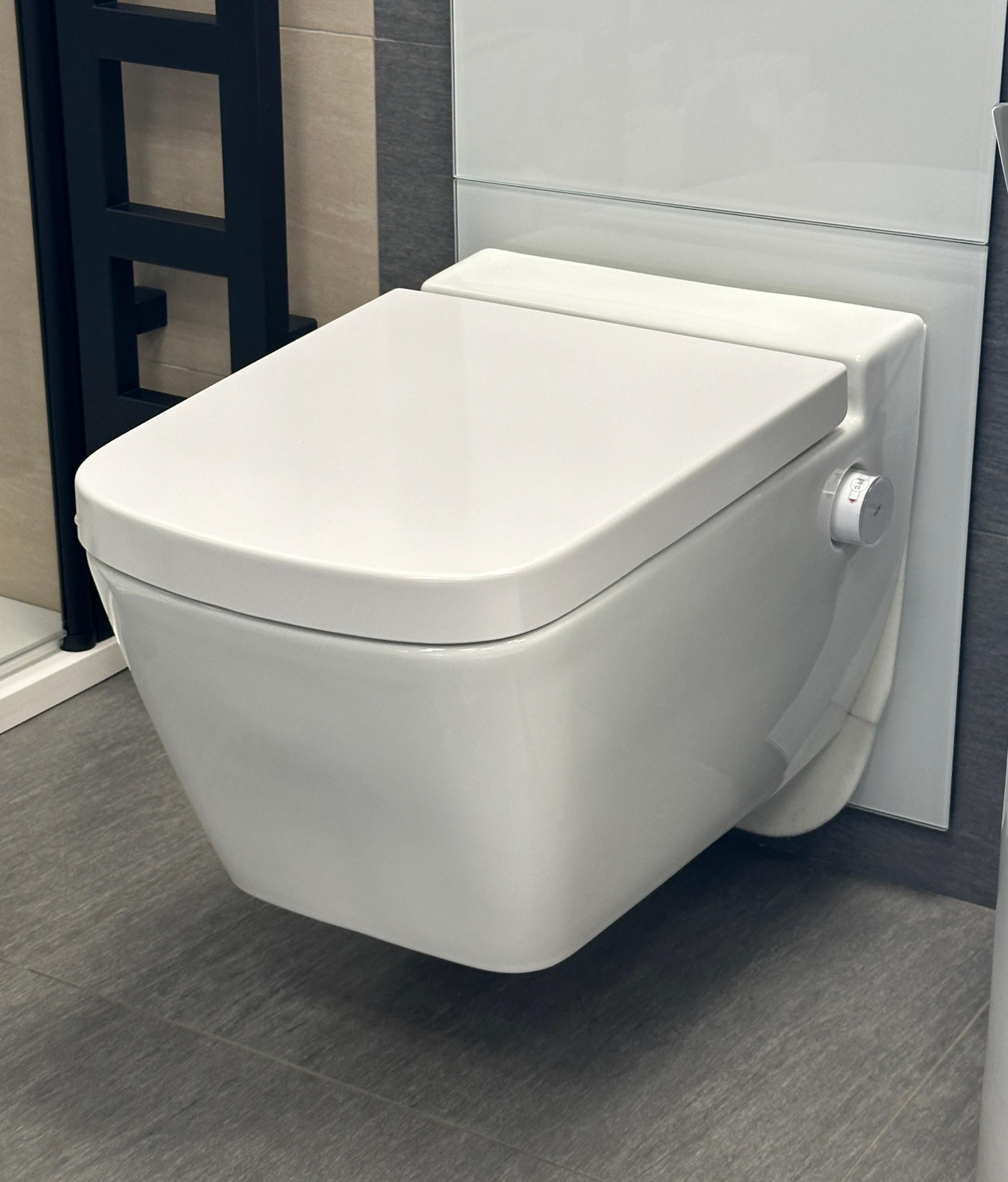 TECEone Toaleta myjąca wisząca bezkołnierzowa z deską wolnoopadającą biała 9700200+9700600 Funkcja myjąca działa bez elektryczności poprzez bezpośrednie podłączenie wody zimnej i ciepłej. Kolor: Biały Wymiary: Szerokość: 400 mm Długość: 540 mm Wysokość: 350 mm Cechy miski WC: Objętość spłukiwania: 6 lub 4,5 litra Kompaktowa konstrukcja - głębokość od ściany: 540 mm, rozstaw montażowy: 180 mm Ukryte mocowanie naścienne oraz ukryte przyłącza wody Miska bezkołnierzowa ze zintegrowaną osłoną przeciw pryskaniu Wstępnie zamontowane bezpieczne mocowanie deski sedesowej TECEone Cechy funkcji myjącej: Intuicyjna kontrola temperatury i ilości wody za pomocą regulatorów obrotowych znajdujących się na bokach miski Płynna regulacja ilości wody w zakresie do 5,6 l/min Indywidualna, płynna regulacja temperatury wody (10-38 °C) Samoczyszcząca dysza myjąca Wymienne nasadki dyszy myjącej Minimalne ciśnienie przepływu: 1 bar (maks. 10 bar) Szczegółowe informacje o desce sedesowej: Chromowane zawiasy metalowe z funkcją wolnoopadającego zamykania Wykonana z białego, odpornego na skręcanie duroplastu Deska do montażu na bolcach wmontowanych fabrycznie w misce TECEone Deskę z pokrywą można łatwo zdemontować w celu wyczyszczenia Deska z pokrywą po zamontowaniu na misce zabezpieczona śrubą Cena dotyczy kompletu miski z deską UWAGA: W celu korzystania z funkcji myjącej należy zaistalować przyłącza ciepłej i zimnej wody z zaworami kątowymi. Sprzedawany zestaw jest ekspozycyjny. Tylko 1 komplet w takiej cenie! Stan Idealny. Towar można obejrzeć na ekspozycji. Warszawa ul. Bartycka 24/26 Pawilon 227