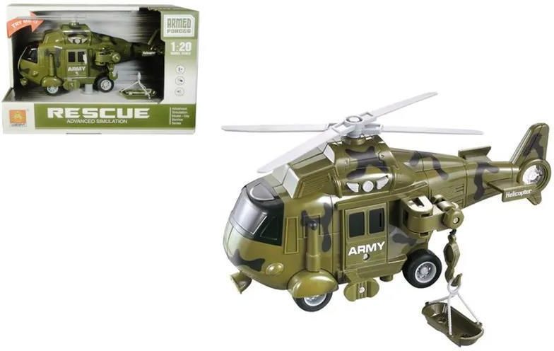 Plastikowy helikopter wojskowy dla dzieci. Zabawka świeci kolorowym światełkiem i wydaje dźwięki wznoszenia się samolotu w powietrze oraz strzelania. Helikopter posiada także wysuwaną linkę oraz nosze. Zabawka działa na baterie typu AG13. Baterie znajdują się w zabawce. Produkt zapakowany w kartonowe opakowanie z okienkiem. Zabawka dla dzieci od 3 lat. Podane wymiary są wymiarami opakowania. Wiek: 3+Producent/osoba odpowiedzialna za bezpieczeństwo produktuKUKURYKU Julia PogorzelskaEKONOMICZNA 442-271 CZĘSTOCHOWAoffice@kukuryku.co34 340 11 50