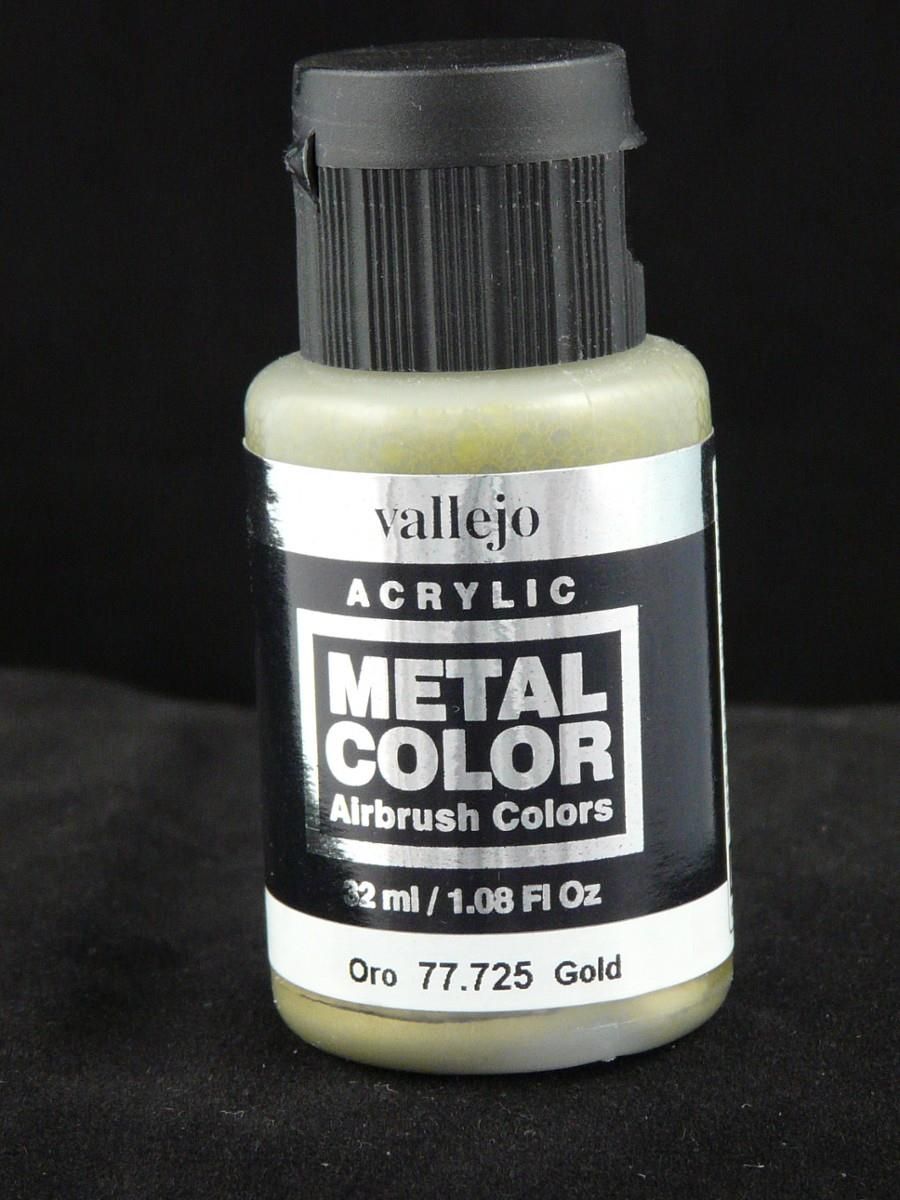 Vallejo 77725 Metal Color 32 ml Gold - 1 szt. - Farba akrylowa Vallejo Metal Colors Buteleczka 32 ml Metal Color to nowa paleta metalizerów wykonanych na bazie wody. Są to farby polecane do aerografów ale mogą być też z powodzeniem stosowane przy tradycyjnym malowaniu pędzlami. Przy produkcji Metal Color zastosowano najnowszą generację aluminiowych pigmentów, które doskonale przylegają do plastiku. Pozwala to na malowanie metalizerami bezpośrednio na modelu bez konieczności stosowania podkładów. Dla uzyskania wysokiej jakości i zwiększenia intensywności aluminiowej powierzchni na kadłubach samolotów można użyć czarnego podkładu (Vallejo Gloss Black Primer 77660). Symbol produktu: VALL-77725 Producent: Vallejo