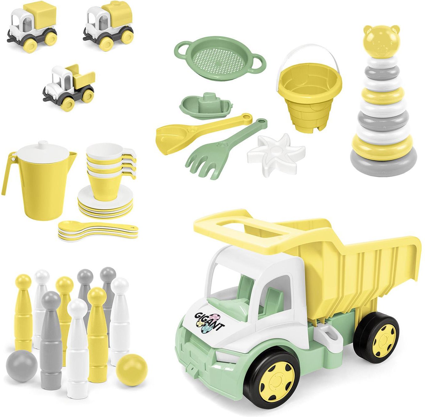 Nowa seria Toys in Trends to niecodzienna oferta zabawek w oryginalnych wersjach kolorystycznych dostosowanych do najnowszych obowiązujących trendów aranżacji wnętrz. Stworzyliśmy cztery niepowtarzalne kolekcje zabawek dopasowane kolorystycznie do czterech magicznych pokojów dziecięcych o bajecznych nazwach: Różana Wata Cukrowa, Słoneczny Poranek, Szmaragdowa Komnata oraz Biszkoptowa Chmurka.Słoneczny Poranek to połączenie pastelowych odcieni słonecznej żółci, szarości, bieli i delikatnego seledynu, z którymi doskonale komponują się nasze zabawki.W skład Zestawu Zabawek Ogólnorozwojowych 6 elementów z serii Słoneczny Poranek wchodzą: Gigant wywrotka Autka Kid Cars Trio: wywrotka, ciężarówka, cysterna Misiowa piramidka 11 el. Zestaw do gry w kręgle 11 el. Serwis Kawowy 19 el. Zestaw do piasku zamek 6 el.