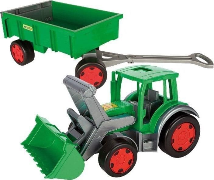 Gigant Traktor Ładowarka z Przyczepą to niezwykle funkcjonalny i solidny zestaw, który został stworzony z myślą o dzieciach uwielbiających dynamiczną, kreatywną zabawę pojazdami budowlanymi. Imponujący rozmiar traktora w połączeniu z dołączoną przyczepą z otwieraną tylną klapą otwiera przed najmłodszymi ogromne możliwości – mogą one ładować, przewozić i rozładowywać różnorodne przedmioty, tworząc przy tym własne scenariusze zabawy. Traktor został wyposażony w ruchomą łyżkę, która pełni funkcję zarówno spychacza, jak i ładowarki, co dodatkowo uatrakcyjnia użytkowanie i pozwala dziecku na lepsze poznanie działania prawdziwych maszyn. Wyjątkową zaletą tego zestawu jest jego solidna i trwała konstrukcja – traktor wytrzymuje obciążenie do 100 kg, a przyczepa do 60 kg, co sprawia, że zabawka jest nie tylko efektowna, ale też wytrzymała i bezpieczna. Długość całego zestawu wynosi 117 cm. W dodatku całość wykonana jest z wysokiej jakości tworzywa sztucznego, odpornego na warunki atmosferyczne, dzięki czemu zabawkę przez cały rok można przechowywać np. w ogródku czy na balkonie. Największą zaletą zabawki jest solidność konstrukcji, dzięki której zestaw służy zabawie latami. Przeznaczony dla dzieci 1+