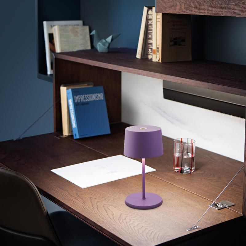Akumulatorowa i ściemnialna lampa stołowa LED Olivia pro mini z wbudowanym akumulatorem o mocy 2,2 W. lampa stołowa LED z aluminiową obudową lakierowaną na kolor liliowy, dyfuzorem z poliwęglanu i źródłem światła LED o mocy 144-150 lumenów. Akumulator lampy Olivia Mini wystarcza na około 9 godzin pracy. Akumulator jest ładowany za pomocą podstawy stykowej dołączonej do zestawu. Lampa stołowa LED Olivia Mini jest wyposażona w przycisk dotykowy w górnej części dyfuzora, który służy do włączania lampy. Przytrzymując go, można regulować natężenie światła w zakresie od 2700 K do 3000 K. Stopień ściemniania jest zapisywany, a przy następnym włączeniu natężenie światła będzie takie samo jak poprzednie ustawienie. Olivia Mini to lampa stołowa LED, która idealnie nadaje się do użytku w barach, restauracjach i restauracjach, ale jest również często używana w domach, sypialniach, salonach i profesjonalnych biurach. Kolekcja Olivia Pro ma stopień ochrony IP65 i dlatego nadaje się zarówno do użytku wewnątrz, jak i na zewnątrz. Wymiary: Ø11 x 22 cm wysokości.