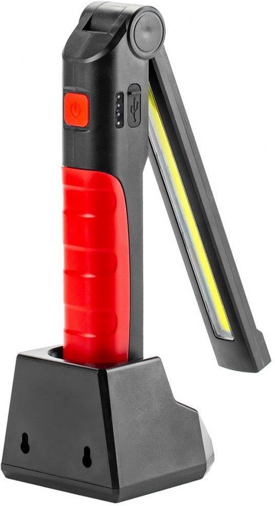 Latarka inspekcyjna ze stacją dokującą WT12 Latarka z mocnym światłem pozwala nawet późnym wieczorem dokonywać potrzebnych napraw. Prezentowana lampa warsztatowa to wysoka jakość i światło LED COB o dużej mocy. Lampa warsztatowa i nie tylko Lampa warsztatowa idealnie nadaje się do profesjonalnych warsztatów, ale także przydomowych ogrodów i majsterkowania. Urządzenie sprawdzi się również podczas kempingu jako dodatkowe oświetlenie. Do zadań specjalnych Wykonanie z najwyższej jakości materiałów pozwalają na zastosowanie latarki nawet w ciężkich warunkach. Produkt niezawodny i skierowany dla wymagających klientów Cechy produktu wbudowany magnes - umożliwia przyczepienia lampy do metalowych elementów wbudowana bateria mocna lampa o jasności maksymalnej 500 lumenów ładowanie lampy kablem USB obudowa lampy odporna na brud, m.in. smar Specyfikacja Strumień świetlny: 500lm Barwa biała 6500K Temperatura robocza: -45° - 50°C Żywotność: 100000h Materiał: ABS + metal Typ światła: COB + LED Wbudowany akumulator Czas pracy na pełnym naładowaniu: 5h Czas potrzebny do pełnego naładowania baterii: 2,5-3h Ładowanie: slot micro USB (kabel w zestawie) Zabezpieczenie przed przeładowaniem Gumowana obudowa Wbudowany magnes Odporność na wstrząsy, kurz i wilgoć Zasilanie: kabel USB Ilość przycisków: 1 Materiał: tworzywo sztuczne ABS Wbudowany uchwyt Trzy tryby świecenia Poziom naładowania