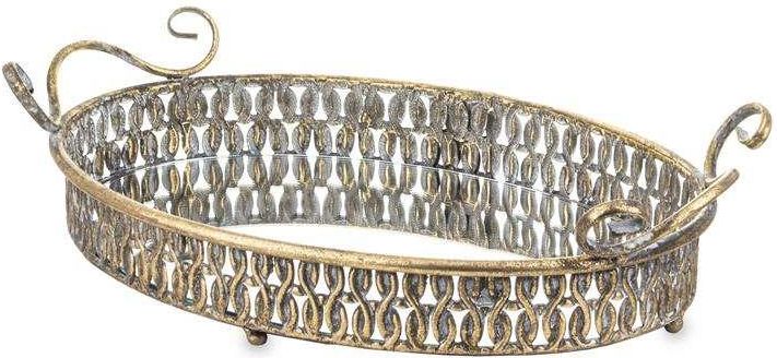 Metalowa, dekoracyjna taca w kolorze antycznego złota to ciekawy dodatek i zarazem dekoracja do stylowej jadalni, kuchni czy salonu. Taca posiada owalny kształt, na końcach zamontowane są uchwyty za pomocą których z łatwością możną ją przenieść. Na wierzchu tacy zamontowane jest lustro przez co patera staje się wizualnie bardziej elegancka. Wysokość: 10 cm Szerokość: 41 cm Głębokość: 27 cm Materiał: szkło, metal Przesyłka: Paczka - doręczenie z wniesieniem Kolor: złoty Informacje dodatkowe: Waga: 2 kg Kod produktu: 139313