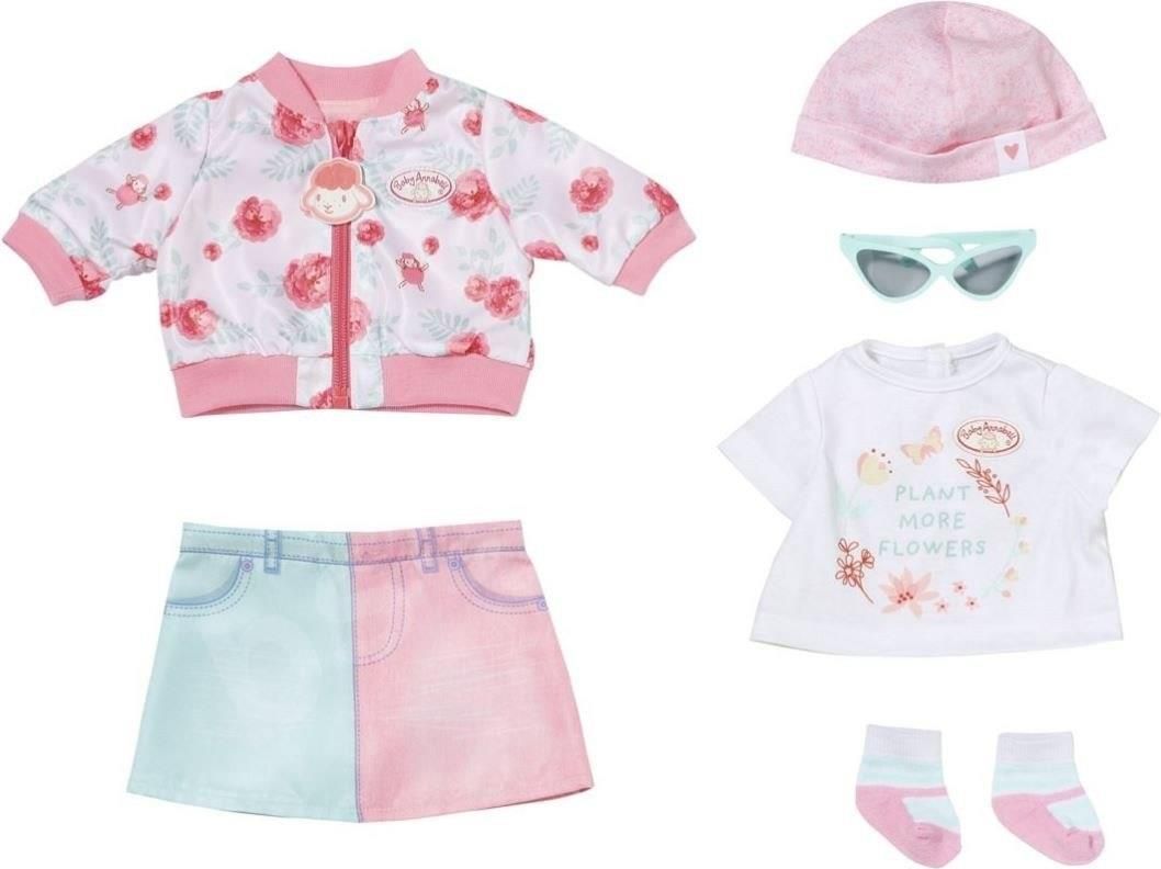 Zapf Creation Baby Annabell® Deluxe Spring 43 cm Świeży wiosenny strój Baby Annabell jest naprawdę fajny. Spódnica w jeansowym stylu jest dwukolorowa. Koszula i marynarka mają nadruki w urocze kwiatowe wzory. Jeśli jest jeszcze trochę za świeżo, Annabell może założyć skarpetki i swobodną kurtkę …