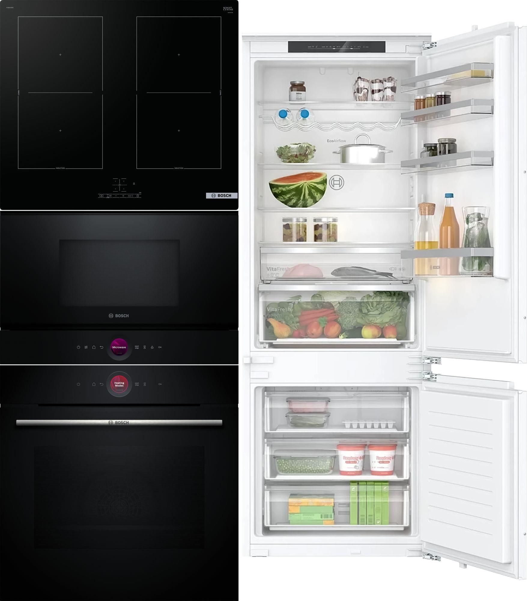 Bosch HBG7241B2 + BEL7321B1 + PVQ61RBB5E + KBN96VFE0 NAJWAŻNIEJSZE CECHY URZĄDZENIA Piekarnik elektryczny HBG7241B2 Najważniejsze parametry: Kolor: Czarny  Wyświetlacz: dotykowy TFT TouchDisplay  Cyfrowy Pierścień Sterujący  Wnętrze piekarnika: emalia antracytowa GranitEmail Ilość rodzajów grzania: 14  Zakres temperatur (°C): 30-300  Prowadnice: drabinkowe  Czyszczenie: parowe, emalia GranitEmail  Pojemność wnętrza: 71 l  Wymiary urządzenia (WxSxG): 595 mm x 594 mm x 548 mm  Home Connect  Ilość szyb w drzwiach: 3 szt. Płyta indukcyjna PVQ61RBB5E Najważniejsze parametry: Typ: Płyta indukcyjna Ilość pól grzejnych: 4 2 strefy CombiZone 17 poziomów mocy TouchSelect: Steruj za pomocą przycisków dotykowych Licznik czasu gotowania PowerBoost: Zwiększenie mocy grzania Wskaźnik zalegania ciepła Wyłącznik główny: Wyłącza wszystkie strefy grzewcze za jednym dotknięciem  Moc przyłączeniowa: 7400 W Chłodziarko-zamrażarka KBN96VFE0 Najważniejsze parametry: Wysokość: 1935 mm Szerokość: 708 mm Głębokość: 548 mm Pojemność całkowita brutto: 383 l NoFrost Supermrożenie Wyświetlacz: LED Poziom hałasu: 34 dB Automatyczne odszranianie w chłodziarce Szuflada VitaFresh Roczne zużycie energii: 256 kWh/rok Wewnętrzne oświetlenie: LED z Soft Start w chłodziarce Klasa efektywności energetycznej: E Alarm akustyczny otwartych drzwi Kuchenka mikrofalowa BEL7321B1 Najważniejsze parametry: Kolor: Czarny Ilość poziomów mocy: 5 Wnętrze: stal szlachetna Sterowanie: sensorowe Pojemność: 21l Czyszczenue: parowe, sufit katalityczny Maksymalna moc mikrofal: 900 W Drzwi otwierane na lewo Oświetlenie: LED Wymiary urządzenia (WxSxG): 382 x 594 x 318 mm AutoPilot 10 INTUICYJNOŚĆ W CYFROWYM KSZTAŁCIE Z naszym Cyfrowym Pierścieniem Sterującym obsługa piekarnika jest nie tylko łatwiejsza, ale też o wiele nowocześniejsza. Zamiast manewrować pokrętłem, możesz intuicyjnie regulować ustawienia piekarnika bezpośrednio na panelu sterowania za pomocą dotyku. Wystarczy przesunąć palcem po obwodzie cyfrowego wizerunku pierścienia na panelu sterowania i potwierdzić ustawienie jednym dotknięciem. TWOJE POTRAWY NA WIDOKU Innowacyjny cyfrowy pierścień sterujący sprawia, że gotowanie jest łatwiejsze niż kiedykolwiek. Przy pomocy niewielkich obrotów wewnętrznego pierścienia możesz uzyskać dowolne ustawienia swojego piekarnika, używając zaledwie jednego palca. Pomocą służy Ci duży panel dotykowy TFT o wysokiej rozdzielczości, z czytelnym tekstem i przyciskami sensorycznymi. Wyraźne obrazy oraz komunikaty tekstowe prowadzą Cię przez każdy krok, gdy nawigujesz pomiędzy opcjami różnych programów. Dzięki temu masz wszystko na oku i w pełni panujesz nad działaniem piekarnika. PROSTY SPOSÓB NA PERFEKCYJNE DANIA Z PIEKARNIKA Dzięki programowi AutoPilot 10, możesz perfekcyjnie przyrządzić swój posiłek. Wystarczy wstawić potrawę do piekarnika i wybrać z wyświetlanego menu odpowiedni - jeden z 10 - automatyczny program jak np. pierś indyka, gulasz, czy pieczeń rzymską. Wprowadź wagę potrawy i wciśnij “Start”. Wtedy AutoPilot zajmie się wszystkim i określi tryb, temperaturę i czas gotowania. Nawet wyłączy program pod koniec czasu gotowania. Ponieważ niektóre potrawy przygotowywane z pomocą programu AutoPilot wymagają użycia naczyń z pokrywką, wnętrze piekarnika zawsze pozostaje czyste. To najprostszy sposób gotowania.