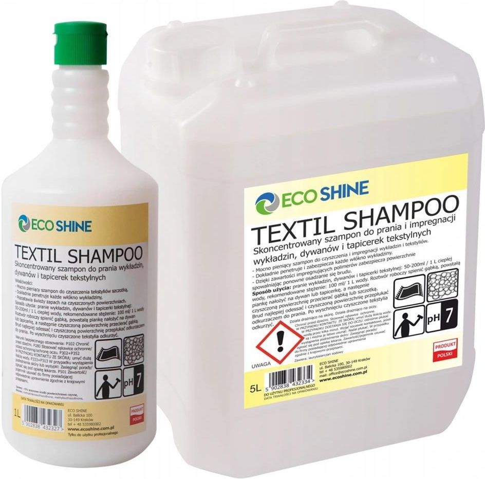 EcoSHINE TEXTIL SHAMPOO 1L szampon do prania wykładzin dywanów tapicerek te ECO SHINE Eco SHINE TEXTIL SHAMPOO – Skoncentrowany Szampon do Prania Wykładzin, Dywanów i Tapicerek Tekstylnych Eco SHINE TEXTIL SHAMPOO to wysokiej jakości koncentrat szamponu do prania wykładzin, dywanów oraz tapicerek tekstylnych. Produkt skutecznie usuwa zanieczyszczenia i plamy z głębszych warstw tkanin, jednocześnie pielęgnując powierzchnie, zapewniając długotrwałą ochronę przed ponownym osadzaniem się brudu. Właściwości produktu Wydajny koncentrat, idealny do prania wykładzin, dywanów i tapicerek tekstylnych. Skutecznie usuwa brud i plamy z głębszych warstw materiałów. Zawiera impregnujące polimery, które zabezpieczają czyszczoną powierzchnię i spowalniają ponowne osadzanie się brudu. Pielęgnuje tkaniny, ożywiając ich kolory i pozostawiając przyjemny zapach świeżego prania. Zakres zastosowania Dywany, wykładziny, tekstylne dywaniki, fotele samochodowe, tapicerki meblowe i samochodowe, fotele, wersalki, kanapy. Sposób użycia i dozowania Przed użyciem wstrząsnąć opakowaniem. W zależności od stopnia zabrudzenia dozować: 50-200 ml/1L ciepłej wody (rekomendowane stężenie: 100 ml/1L wody). Przed pierwszym użyciem, sprawdzić trwałość kolorów, nakładając preparat w niewidocznej części powierzchni. Dokładnie odkurzyć czyszczoną powierzchnię. Roztwór roboczy spienić, a powstałą pianę nałożyć na powierzchnię. Przecierać gąbką lub szorować szczotką do momentu rozpuszczenia zabrudzeń. Zabrudzenia najlepiej usunąć odkurzaczem piorącym lub ściągaczką/zbierakiem do dywanów. Po zakończeniu prania, przepłukać czyszczoną powierzchnię wodą. Bezpieczeństwo stosowania Przed pierwszym użyciem zapoznać się z kartą charakterystyki preparatu. Przed użyciem sprawdzić trwałość kolorów w niewidocznej części powierzchni. Nie stosować na tapicerce skórzanej. Charakterystyka techniczna Termin trwałości: 24 miesiące. Gęstość: 1,0 g/ml. pH koncentratu: 7. Przechowywanie Przechowywać w oryginalnych, szczelnie zamkniętych opakowaniach, w pozycji pionowej, w temperaturze od 5 do 25°C, z dala od źródeł ognia. Dostępne opakowania Butelka 1 litr, kanister 5 litrów. pojemność (l): 1 Skoncentrowany szampon do prania wykładzin, dywanów i tapicerek tekstylnych