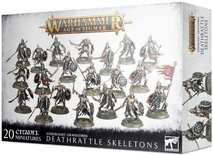 WARHAMMER AGE OF SIGMAR SOULBLIGHT GRAVELORDS: DEATHRATTLE SKETELONS Deathrattle Skeletons grzmią do przodu w szyku, ich pożółkłe czaszki pozbawione wyrazu, mające na celu unicestwienie żywych. Nawet jeśli szkieletowy wojownik zostanie roztrzaskany na kawałki, horror trwa nadal – pole bitwy …