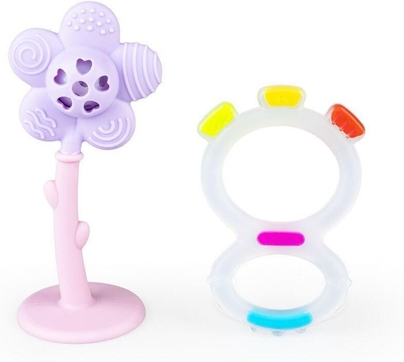 Pastelowo i uroczo witamy na świecie! Pierwszy zestaw dla maluszka składa się z dwóch praktycznych zabawek: gryzaka Ósemki oraz Radosnego Kwiatka w kolorze fioletowym. Zabawki posiadają wypustki, które podczas gryzienia będą delikatnie masować dziąsła bobasa, przynosząc mu tym samym ulgę w ząbkowaniu. Kształt gryzaka i grzechotki ułatwia małym rączkom chwytanie zabawek. Zestaw sprawdzi się świetnie w charakterze prezentu.Produkt przeznaczony jest dla dzieci od 3 miesiąca życia.Cechy produktu:w zestawie 2 zabawki: gryzak Ósemka i grzechotka Radosny Kwiatek fioletowy;grzechotka posiada podstawkę, dzięki czemu kwiatek można postawić;zabawki posiadają wypustki;kształt zabawek dostosowany jest do małych rączek;wiek: 3m+.