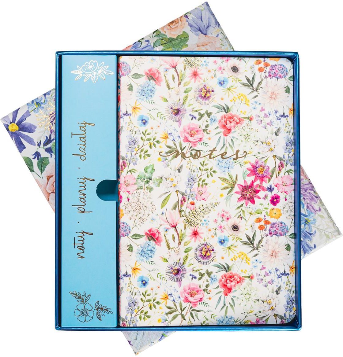 Zestaw Prezentowy Zima Zestaw Prezentowy Zima składa się z eleganckiego pudełka, które oczarowuje wieczkiem ozdobionym kwiatowym wzorem z delikatnymi złoceniami oraz metalizowaną podstawą w idealnie dopasowanym kolorze. W środku znajdują się pięć starannie wyselekcjonowanych, romantycznych notatników. Ich kwiatowe okładki są zdobione tłoczeniami złotą folią, tworząc unikalną i piękną grafikę. Kolorowe przeszycia grzbietów dodają notatnikom wyjątkowego charakteru, podkreślając dbałość o detale. Wszechstronne Zastosowanie Notatniki doskonale sprawdzą się jako pamiętnik, szkicownik lub miejsce na codzienne zapiski. Najwyższej jakości pudełko upominkowe jest solidne i trwałe, co sprawia, że po zapełnieniu notatników wspomnieniami, pudełko może być wykorzystane jako bezpieczne schowanko na inne cenne przedmioty. Wymiary Zestaw ma wymiary 185x210x30 mm, co czyni go kompaktowym, ale wystarczająco pojemnym, aby pomieścić wszystkie notatki, szkice i wspomnienia. EAN: 5905741033049