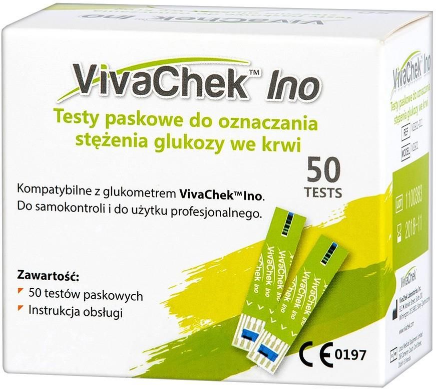 Opis VivaChek Ino Wyrób medyczny w postaci pasków testowych przeznaczonych do oznaczania stężenia glukozy we krwi. Paski służą do samodzielnego lub profesjonalnego pomiaru poziomu cukru we krwi włośniczkowej (np. z opuszki palca). Do zastosowania wyłącznie z glukometrami VivaCheck Ino. …