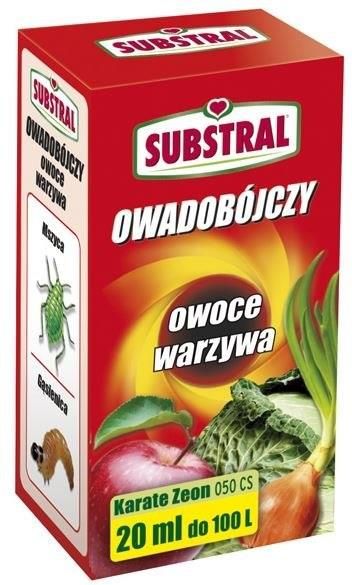 Substral Karate Zoen Owoce Warzywa Szybko działający środek owadobójczy (insektycyd) do zwalczania mszyc, gąsienic, stonki i innych szkodników gryzących i ssących w uprawie roślin sadowniczych, warzywnych i rolniczych. Preparat w formie zawiesiny kapsuł w cieczy do rozcieńczania wodą, o działaniu kontaktowym i żołądkowym. Na roślinie działa powierzchniowo. Przeznaczony do stosowania przy użyciu opryskiwaczy ręcznych Zastosowanie Owoce, warzywa. Skład Lambda-cyhalotryna - 50g/L (4,81%). Zwalcza Mszyce, gąsienice, stonkę i inne szkodniki gryzące i ssące Środki owadobójcze Substral działają na dwóch płaszczyznach - pomagają pozbyć się uciążliwych szkodników oraz zabezpieczają roślinę przed ich powrotem. Są odporne na działanie deszczu oraz zapewniają roślinom długotrwałą ochronę. Nasze środki owadobójcze przeznaczone są do roślin ozdobnych, krzewów owocowych oraz warzyw. Można je stosować zarówno w ogrodzie, jak i domu