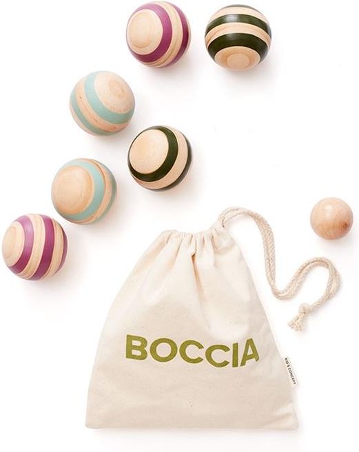 Zagrajmy w Boccię! To idealna gra na letnie wyjścia do ogrodu lub na plażę. Rozmiar kulek jest dostosowany do małej rączki, więc nawet najmłodsi mogą się przyłączyć. Wybierz swoje ulubione kolorowe kulki i rzuć wyzwanie każdemu, kto się odważy. Celem tej gry jest rzucenie kulek tak, by znalazły się jak najbliżej małej drewnianej kulki. Boccia jest rozgrywana przez 2-3 drużyny składające się z 1-2 graczy. Zaczynamy! Informacje dodatkowe: Materiał 6 kulek: sosna. 1 kulka: sklejka. Torba: bawełna. Wymiary: 6 kulek: 6cm. 1 kulka: 4cm Zabawka nieodpowiednia dla dzieci poniżej trzeciego roku życia. Certyfikaty: EN71, wykonane z drewna z certyfikatem FSC, oznaczenie CE Instrukcja czyszczenia: Czyść wilgotną ściereczką. Wytrzyj do sucha czystą szmatką.