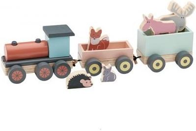 Drewniany pociąg z lokomotywą, zbudowaną z klocków, oraz dwoma wagonami, które można łatwo łączyć i rozłączać. Drewniany pociąg z lokomotywą, zbudowaną z klocków, oraz dwoma wagonami, które można łatwo łączyć i rozłączać. Zestaw zawiera pięć różnych figurek zwierząt, które mogą podróżować pociągiem. Informacje dodatkowe Długość x szerokość x wysokość: 44,5 x 9,5 x 11 cm. Materiał Pociąg: drewno kauczukowe. Zwierzęta: sklejka. Klocki: schima, buk. Koła: schima. Oś: stal nierdzewna. Sznurek: bawełna. Certyfikaty: EN71, oznaczenie CE Rekomendowany wiek dziecka: 12M + Instrukcja czyszczenia Czyść wilgotną ściereczką. Wytrzyj do sucha czystą szmatką. Koła można smarować olejem parafinowym, dopuszczonym do kontaktu z żywnością, lub olejem lnianym.