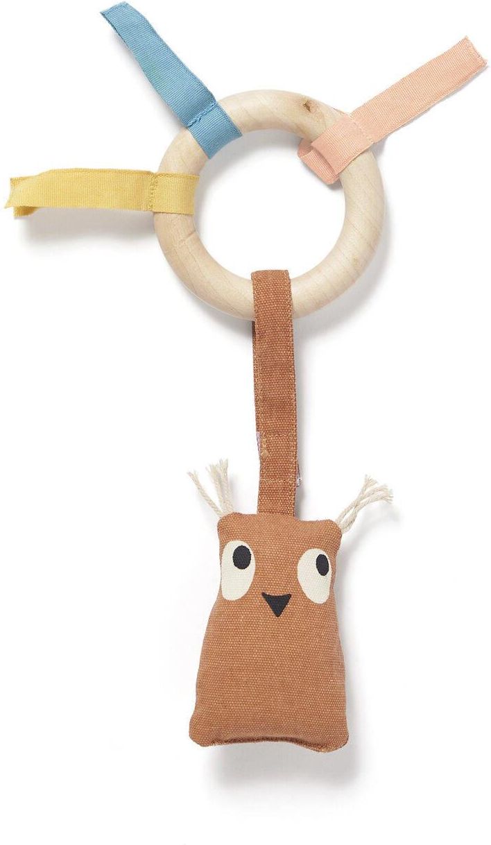 Elementy o różnej fakturze: drewniane kółko z drewna bukowego z certyfikatem FSC - do gryzienia, chwytania i zabawy, kolorowe wstążeczki i mięciutka sowa stymulują zmysły i pozytywnie wpłyną na rozwój sensoryczny Twojego dziecka.