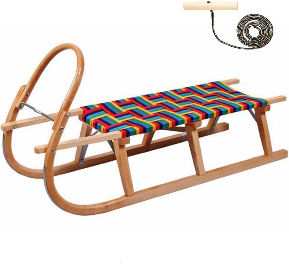 Klasyczne dziecięce drewniane sanki ze sznurkiem. Długość 113 cm, szerokość 30 cm, wysokość 30 cm. Maksymalne obciążenie 80 Kg. W zestawie znajduje się sznurek do ciągnięcia.