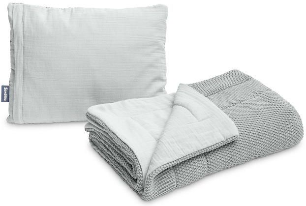 Komplet do łóżeczka to połączenie najwyższej jakości muślinu z jednej strony oraz przędzy bawełnianej z drugiej. Dzięki takiemu połączeniu powstał elegancki zestaw, który łączy ze sobą klasę, jakość i praktyczność. Komplet sprawdzi się zarówno w ciepłe letnie dni jak i w trakcie chłodniejszej zimy. Składa się z dwustronnej płaskiej poduszki oraz kołderki z antyalergicznym wypełnieniem. Wymiary zostały dobrane tak, by idealnie sprawdzić się w łóżeczku, gondoli czy kołysce, a nawet zostać „ulubionym kocykiem”, który można wykorzystać w wózku spacerowym. Dzięki skandynawskiemu stylowi zestaw pasuje do każdego dziecięcego pokoiku. Tkaniny z których wykonany został komplet oraz wypełnienie posiadają certyfikat OEKO-TEX 100. Najważniejsze cechy: Komplet zaprojektowany z myślą o łóżeczku, ale sprawdzi się również w wózku Wykonany z najwyższej jakości tkaniny muślin oraz eleganckiej dzierganej przędzy bawełnianej Wymiary poduszki: 30×40 cm Wymiary kocyka: 100×80 cm Pozwala na utrzymanie odpowiedniej temperatury i mikroklimatu przy skórze dziecka Posiada antyalergiczne wypełnienie Wykonany z tkanin z certyfikatem OEKO-TEX 100 Produkt polski Rozmiar: Poduszka: ok. 30x40cm Kołderka ok. 100x80 cm Sposób konserwacji: Prać ręcznie. Maksymalna temperatura prania to 30 stopni. Nie używać wybielacza. Prać w łagodnym detergencie lub środku piorącym do kolorów. Nie czyścic chemicznie. Maksymalna temperatura prasowania to 110 stopni. Skład: Warstwa wewnętrzna: 100% Bawełna Warstwa zewnętrzna: 100% bawełna Otulina: 100% poliester