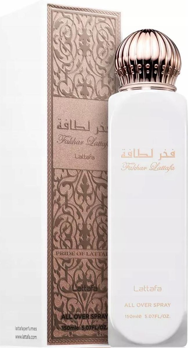 Lattafa All Over Fakhar for Women - Bodyspray 150 ml -------------------------------- Lattafa Fakhar All Over Bodyspray to mgiełka zapachowa do ciała (All Over Spray) o pojemności 150 ml, przeznaczona dla kobiet, które cenią sobie intensywne, kwiatowe nuty połączone z owocowym akcentem i ciepłym, kremowym akordem bazy. Idealny produkt na cały dzień - spryskaj nim ciało, ubranie lub włosy, by poczuć świeżość i przyjemny zapach przez kilka godzin. -------------------------------- Dla kogo i kiedy używać Grupa docelowa:kobiety, które lubią zapachy kwiatowe, pełne, „bogate” w akordy białych kwiatów, ale nie przesadnie ciężkie. Doskonałe dla tych, którzy chcą zaznaczyć swoją obecność zapachem, ale bez przytłaczającej ostrości. Pora roku: wiosna i lato - świeże nuty kwiatów i pomarańczy idealnie pasują do cieplejszych dni; sprawdzi się też wczesna jesień, jeśli szukasz czegoś kwiatowego z lekkim drzewnym podkładem. Okazje: codzienne wyjścia, randki, spotkania towarzyskie; także sprawdzi się na wieczór, gdy chcesz zabłysnąć zapachem kwiatowym z charakterem. -------------------------------- Wskazówki użycia i przechowywania Spryskuj ciało po kąpieli, kiedy skóra jest lekko wilgotna - zapach się lepiej „przyczepi”. Możesz też zastosować spray na ubranie lub włosy - unikać bezpośrednio jasnych tkanin, jeśli produkt może zostawiać ślady (zawsze zrobić próbę). Przechowywać w suchym, zacienionym miejscu, z dala od silnego światła i wysokich temperatur - by utrzymać intensywność i jakość zapachu. Spis nut zapachowych Nuty głowy: Kwiat pomarańczy Nuty serca: Tuberoza, jaśmin Nuty bazy: Wetyweria, paczula