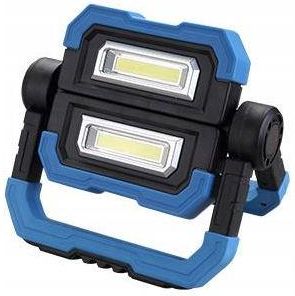 NAŚWIETLACZ HALOGEN LED przenośny 2x 5W 4500K Wykorzystana w trakcie produkcji technologia LED sprawia, że produkt jest znacznie wydajniejszy i ekonomiczny. Wbudowany akumulator umożliwia komfortową pracę i umieszczenie go nawet w trudnodostępnych miejscach, bez dojścia do sieci. Naświetlacz posiada trzy tryby: Pierwsze naciśnięcie przycisku uruchamia 2 światła ze 100% mocą. Drugie naciśnięcie przycisku uruchamia 1 światło z 50% mocą. Trzecie naciśnięcie przycisku uruchamia 2 światło z 50% mocą. Czwarte naciśnięcie przycisku wyłącza całkowicie naświetlacz. PARAMETRY TECHNICZNE Moc: 2*5W COB LED Zasilanie: 1 x 5000mAh Jasność: 1000lm Temperatura światła (CCT): 4500K CRI (Ra): >80 Czas ładowania: 5h Czas świecenia: 3-8h Klasa odporności: IP54 Wymiary: 252 x 207 x 50 [mm] Materiał: ABS + TPR Kolor: Niebieski + czarny Wyposażenie dodatkowe: 4 magnesy na uchwytach oraz port USB (możliwość działania jako powerbank) Naświetlacz swoje uniwersalne zastosowanie znajdzie podczas prac budowlanych, drogowych, w warsztatach, na kempingach, polach namiotowych oraz jako wyposażenie samochodów specjalnych (pożarniczych, karetek). Produkt dysponuje dwoma źródłami światła o łącznym natężeniu 1000lm. Praca z wykorzystaniem połowy mocy znacznie wydłuża czas działania. Wbudowany akumulator można wykorzystać jako powerbank za pomocą portu USB. Wygodne uchwyty umożliwiają dogodne ustawienie kierunku światła. Odpowiednie odprowadzanie ciepła znacznie przedłuża żywotność zastosowanych diod LED w naświetlaczach. Stopień ochrony IP44 gwarantuje ochronę przed zachlapaniem i zanieczyszczeniami.