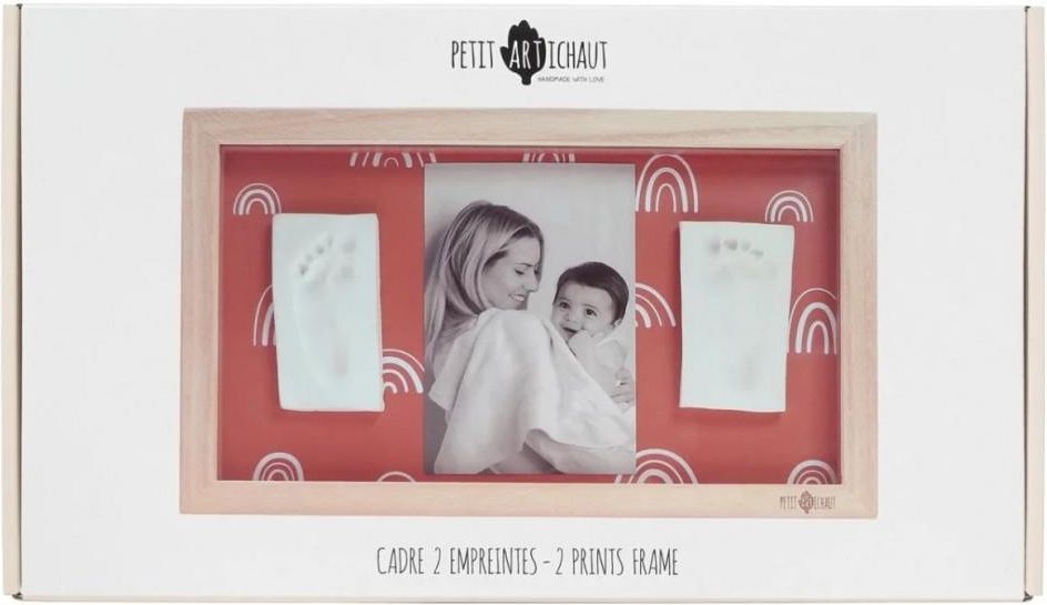 Petit Artichaut Ramka na dwa odciski i zdjęcie - Tęcza Ramka na dwa odciski i zdjęcie to idealne rozwiązanie do wyeksponowania odcisków dłoni lub stóp dziecka oraz fotografii. Stworzona z myślą o rodzicach bliźniąt lub tych, którzy pragną uchwycić etapy rozwoju swojego dziecka. Długa ramka, przeznaczona do powieszenia na ścianie, oferuje odwracalną niebieską wkładkę z motywem fal lub gładką. W zestawie znajduje się hipoalergiczna glinka, wałek oraz instrukcje, które ułatwią wykonanie odcisków. Cechy Idealny prezent na narodziny dziecka. Łatwy i szybki w użyciu. Bezpieczny dla skóry dziecka. Doskonała dekoracja do pokoju dziecięcego. Ramka drewniana: czyścić miękką, suchą ściereczką. Glinka hipoalergiczna: aby na długo zachowała swoje właściwości należy trzymać w temperaturze pokojowej, w suchym miejscu i z dala od światła.