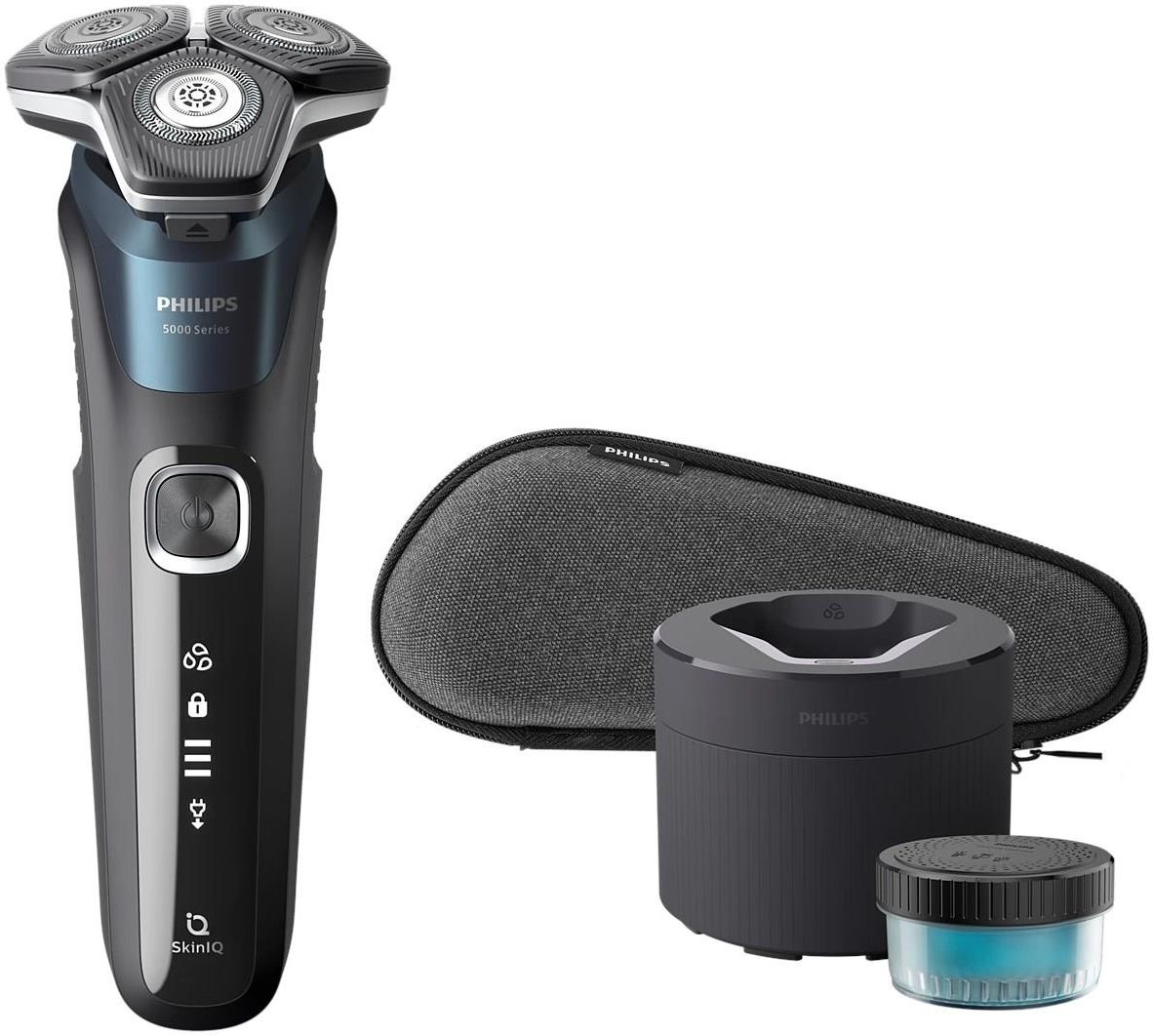 PHILIPS serii 5000 Golarka elektryczna na mokro i na sucho S5889/50 Golarka Philips Series 5000 zapewnia dokładne i komfortowe golenie, usuwając więcej włosków za jednym pociągnięciem — nawet przy 3-dniowym zaroście. Dzięki zaawansowanej technologii SkinIQ urządzenie wykrywa gęstość zarostu i dostosowuje do niego swoją moc, gwarantując skuteczność i delikatność dla skóry. Precyzja i wydajność w każdym ruchu Ostrza SteelPrecision wykonują aż 90 000 cięć na minutę, co sprawia, że golenie jest o 17% dokładniejsze*. 45 samoostrzących się ostrzy zostało wyprodukowanych w Europie, by zapewnić najwyższą jakość cięcia przy każdym użyciu. Eko-design i zrównoważony rozwój Golarka produkowana jest w zakładach zasilanych wyłącznie energią odnawialną. Opakowania nadają się do recyklingu, a urządzenie posiada certyfikat Eco Passport. Adapter USB dostępny jest osobno — wszystko z myślą o ograniczeniu odpadów. Elastyczność i dopasowanie W pełni obrotowe głowice 360° dopasowują się do konturów twarzy i głowy, zapewniając maksymalny kontakt ze skórą. System czujników odczytuje gęstość włosów aż 250 razy na sekundę, a golarka automatycznie dostosowuje moc — wszystko po to, by golenie było szybkie i bezproblemowe. Wbudowany trymer i długi czas pracy Wysuwany precyzyjny trymer idealnie sprawdza się do stylizacji wąsów i bokobrodów. Akumulator pozwala na 60 minut bezprzewodowego golenia po pełnym ładowaniu, a szybkie 5-minutowe doładowanie wystarcza na jedno pełne golenie. Czyszczenie w minutę Wydajna kapsułka czyszcząca czyści i smaruje golarkę w zaledwie 1 minutę, zachowując jej wydajność na dłużej. Jest 10 razy skuteczniejsza niż mycie wodą, a przy tym niewielka i łatwa do przechowywania — idealna w domu i w podróży.