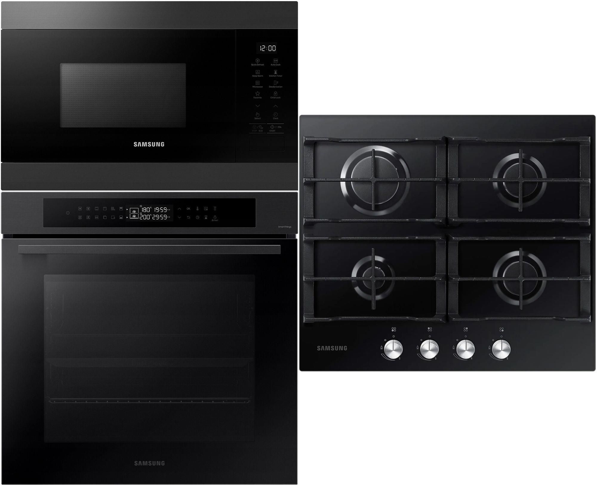 Zestaw SAMSUNG NV7B4220ZAB + MS22M8254AM + NA64H3000AK grafitowy komplet agd piekarnik + mikrofala + płyta gazowa • Kolor zestawu: Czarny, Grafitowa stal • Ilość sprzętów: 3 • Rodzaje sprzętów: piekarnik, kuchenka mikrofalowa, płyta gazowa • Wykończenie: Czarne szkło • Sterowanie: sensorowe, pokrętła