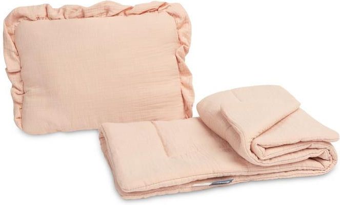 W skład kompletu wchodzi poduszka i kocyk wykonane z przyjemnego w dotyku muślinu. Komplet idealnie sprawdza się w wózku, łóżeczku czy jako miękka mata dla Maluszka. Sama poduszka może służyć jako przytulanka. Zestaw został wykonany z dwóch materiałów – strona wewnętrzna to 100% bawełna, a warstwa zewnętrzna to miękki muślin. Skład: poszycie - 100% bawełna otulina - 100% poliester Sposób konserwacji: Prać ręcznie w temperaturze max. 40⁰C Nie używać wybielacza. Prać w łagodnym detergencie lub środku piorącym do kolorów. Nie czyścić chemicznie. Prasować tylko warstwę wewnętrzną w temp. max. 110⁰C.