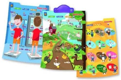 SMILY PLAY 80785 Plakaty Interaktywne Mądra Główka to seria zabawek Smily Play, która uczy i pobudza rozwój dziecka poprzez zabawę. Plakaty interaktywne Mądra Główka to zestaw trzech wymiennych plansz z zadaniami, na których łącznie znajduje się 46 obrazków. Podczas zabawy dziecko zdobywa wiedzę o zwierzętach, zawodach i częściach ciała. Zabawka rozwija język dziecka, uczy budowania poprawnych zdań. Dodatkowo plansza Części Ciała jest dwujęzyczna (polsko-angielska). Uczy angielskich nazw części ciała. Zabawka posiada 2 tryby zabawy: nauka oraz quiz. Tryb Nauki: - uczy nazw zwierząt, zawodów i części ciała, - uczy budowania zdań - uczy angielskich nazw części ciała Tryb Quiz: - dziecko może sprawdzić swoją wiedzę, - plakat ocenia odpowiedzi. W quizie na wszystkie pytania dziecko odpowiada dotykając odpowiednich przycisków na magicznej planszy. Dobra odpowiedź nagrodzona jest miłym sygnałem dźwiękowym. Natomiast o złej odpowiedzi informuje ostrzegawczy sygnał dźwiękowy. Plakat należy położyć na płaskiej powierzchni lub zawiesić na ścianie. Wymiary opakowania: 45 x 21,5 x 5,5 cm Wymiary plakatu: 57 x 42 cm Wymagane baterie: 3 x AAA (niedołączone) Wiek od 3 do 5 lat.