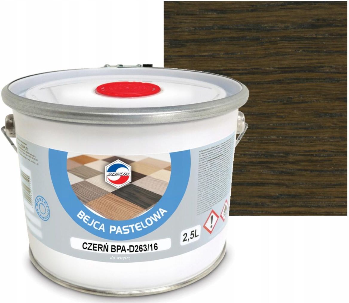 Bejca pastelowa SOPUR Szybkoschnąca, jednorodna i łatwo rozlewająca się bejca do drewna iglastego i liściastego. Czas schnięcia: ok. 15-30 minut Wydajność: ok. 10 m2/l Stosowanie: do wnętrz Pojemność: 2,5l Kolor: Czerń BPA-D263/16 Posiada szeroką gamę modnych, rozbielonych kolorów nawiązujących do barw natury. Produkt na bazie rozpuszczalników organicznych i pigmentów, który charakteryzuje się dobrą odpornością na światło wewnątrz pomieszczeń. Zastosowanie bejcy obejmuje dekoracyjne malowanie drewnianych i drewnopochodnych elementów meblowych, schodów i podłóg. Bejca jest dostępna w trzech liniach o różnych parametrach, w zależności od oczekiwanych efektów i potrzeb użytkownika. Przed aplikacją, drewniane powierzchnie powinny być dokładnie oczyszczone i wyszlifowane, a wyrób bejcy dokładnie wymieszany. Bejce pastelowe można nanosić natryskiem pneumatycznym lub hydrodynamicznym na różne gatunki drewna. W celu podkreślenia pór drewna, bejce o indeksach BPA i BPA-D można przetrzeć flanelą wzdłuż słojów drewna. Kolory mogą się różnić w zależności od ustawień monitora czy telefonu. Barwienie należy wykonywać w temperaturze otoczenia od 5°C do 30°C. Po aplikacji, barwione elementy należy suszyć w temperaturze 20°C przez około 15-30 minut. Powierzchnie wybarwione należy pokryć warstwą nawierzchniową o wysokiej odporności na promienie UV, zgodnie z instrukcją jej stosowania. Warto jednak pamiętać, że kolory wyświetlane na monitorze lub telefonie mogą się nieznacznie różnić od rzeczywistych odcieni bejcy. UWAGA! Ze względu na gęsty pigment, przed jak i w trakcie aplikacji, bejce należ starannie wymieszać mechanicznie!