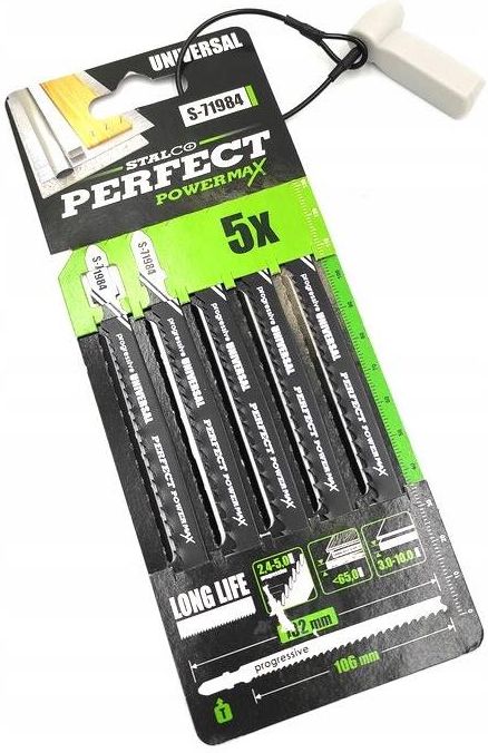 Brzeszczoty do wyrzynarki 132 mm 5 sztuk STALCO S-71984 Brzeszczot inaczej nazywany jest ostrzem do cięcia różnego rodzaju materiałów w zależności od rodzaju uzębienia oraz swojej twardości. Przeważnie brzeszczoty są stosowane do prostego lub skośnego cięcia tworzyw sztucznych czy stopów metali. Ten model przeznaczony jest do cięcie drewna oraz drewnianych elementów. Brzeszczot pozwala na wycięcie dobrze wyglądających oraz estetycznych otworów. Takie rozwiązanie sprawi że cięcie jest sprawne oraz estetyczne. Dane techniczne dokładność wykonania zapobiega schodzeniu brzeszczotu z linii cięcia przy prawidłowym naciągu marka: STALCO do drewna długość 100 mm wykonany ze stali węglowej