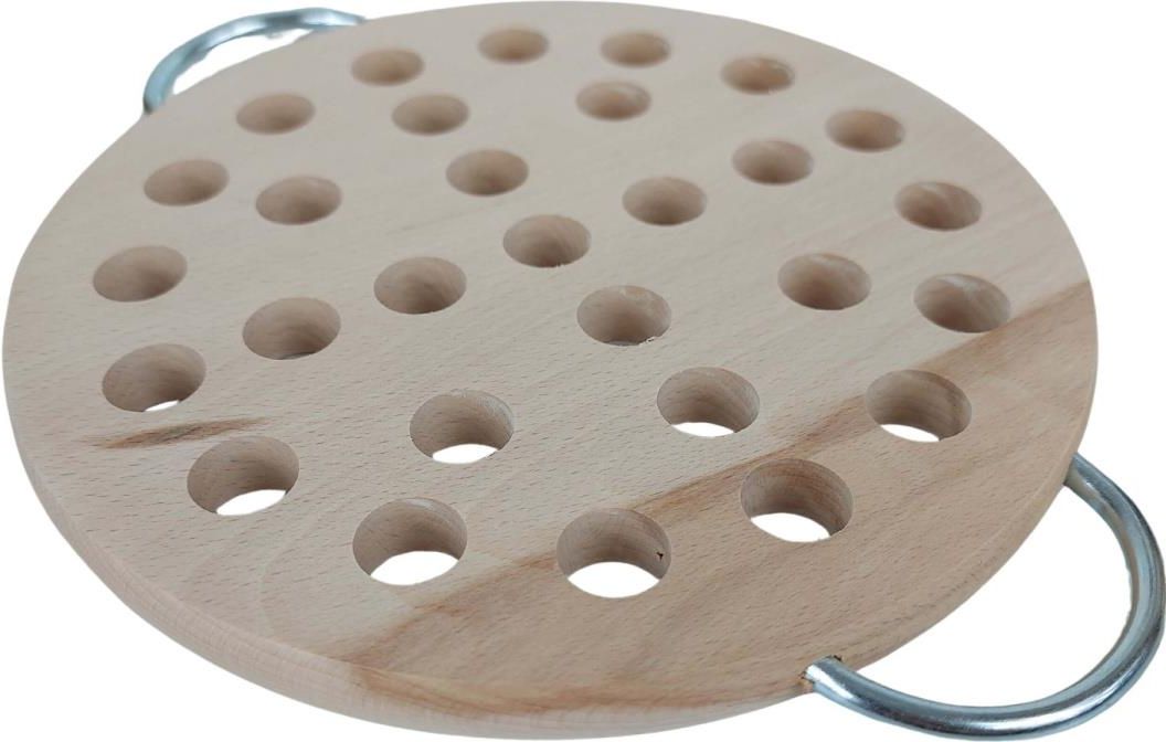 Cedzak wykonany z drewna bukowego, posiada uchwyty metalowe Opis ogólny starannie wykonany z dbałością o szczegóły, solidne twarde bukowe drewno, wygodny, funkcjonalny i estetyczny, łatwy w utrzymaniu czystości, prosty w przechowywaniu, praktyczny i przydatny element w każdej kuchni służący przez długie lata, ekologiczny i bezpieczny, produkt Polski. Wymiary średnica 21,5 cm ( średnica bez uchwytów) wysokość ok;1,4cm.