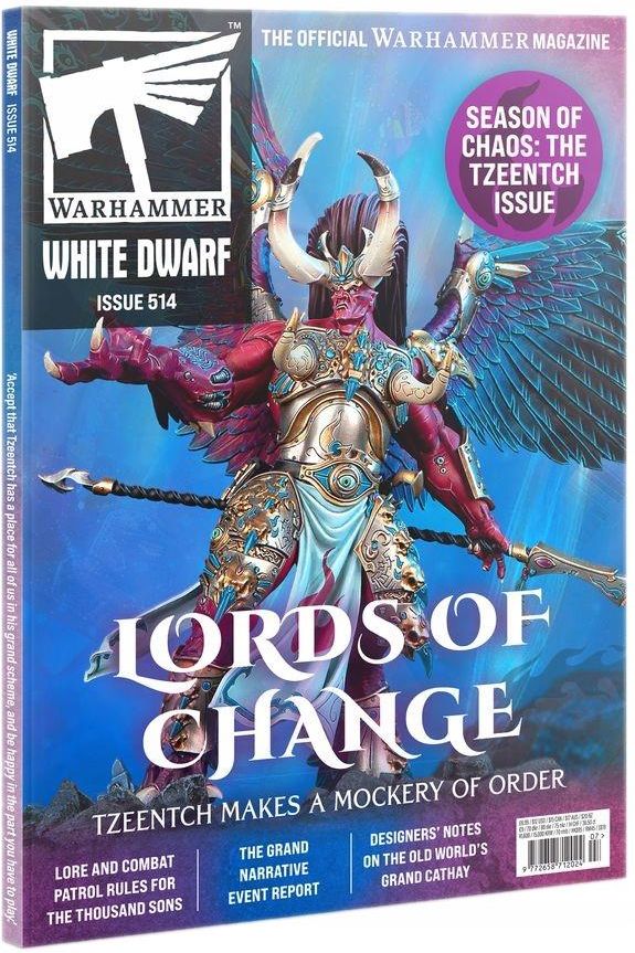 WARHAMMER 40000 WHITE DWARF ISSUE 514 LIPIEC 2025 ENG UWAGA! PRODUKT W WERSJI ANGIELSKIEJ! White Dwarf – oficjalny pergamin imperiów Warhammera – wypełniony po brzegi miesięczną dawką wyjątkowej zawartości: nowe zasady, tła fabularne, opowiadania, cykliczne rubryki, goście specjalni i wiele więcej. Oto, co czeka cię w wydaniu lipcowym: Planet Warhammer Miniatury, listy oraz pytania nadesłane przez lojalnych hobbystów. Do tego nowiny ze świata modelarskiego! Worlds of Warhammer Zakazana wiedza o Bogach Chaosu obnażona przez Phila i Andy’ego – naszych nadwornych heresiarchów. Hobby Hangout Chcesz, by twoje modele nosiły ślady dawnych bitew? Dan ma dla ciebie kilka świętych wskazówek! WARHAMMER 40,000 Notes on the Great Conspirator Rozważania o nikczemnym Changer of the Ways, prosto z archiwów Tytana. Prisms of Perception Przewodnik po artefaktach i narzędziach, które pozwalają psykerom utrzymać koncentrację (i nie, nie chodzi o zabawki antystresowe). Warptongue's Hex-pact Thousand Sons przywołują demoniczne posiłki w nowym Combat Patrol. Aspects of War Zasady prowadzenia bitew w strefach wypaczonych przez spaczeń i mutację. WARHAMMER AGE OF SIGMAR Fate and Feculence Historia odwiecznego konfliktu między Tzeentchem a jego odrażającym przeciwnikiem – Grandfather Nurgle. The Fires of Change Nowa Army of Renown wkracza na scenę z misją przemiany... i spalenia wszystkiego, co się da. Basic Training Warplock jezzails w gotowości! Czas na intensywny trening fazy strzelania. INNE ARTYKUŁY Heralds of Tzeentch Galeria sług Change Goda w całej ich wielopostaciowej chwale. Czysta ekstaza mutacji! Tales From the Grand Narrative Czy była wielka? Tak. Czy była narracyjna? Jeszcze jak. Szczegółowy raport z wydarzenia, które przeszło do legendy. The Falling Blossom Reflektor pada na artystycznie dopieszczoną armię Ynnari, świeżo po występie w Grand Narrative. Designers' Notes: Grand Cathay To miesiąc Smoka (Emperor)! Projektanci Starego Świata opowiadają o tajemnicach Grand Cathay. Trials of Albarak: A Debt of Souls Saga Albaraka trwa – tym razem schodzi z niebios w głębiny zapomnianych głębin. WHITE DWARF BUNKER Access Granted Wyzwania malarskie i najnowsze wieści z Bunkra. The Warhammer Underworlds League Rzut oka na Bunkerową ligę Underworlds – oraz kilka pomysłów na własne rozgrywki. Satellite Uplink Twoje jednostki szeregowe na paradzie. Czy guziki lśnią jak trzeba? Bunker Bingo! Czym zajmowała się załoga White Dwarf w tym miesiącu? Może odrobiną malowania… może czymś więcej? BONUS Każdy egzemplarz White Dwarf 514 zawiera tekturową wkładkę z dwustronną kartą ze scenariuszami miesiąca dla Warhammer 40,000 oraz Age of Sigmar, a także cztery karty przypominające o Combat Doctrine dla graczy Space Marines.