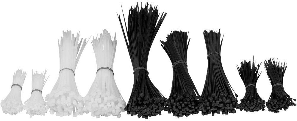 Dla tych, którzy potrzebują naprawdę dużo opasek! Zestaw zawiera 300 opasek białych 2,5x100 mm, 200 czarnych 2,5x100 mm, 200 białych 4,8x200 mm, 200 czarnych 4,8x200 mm oraz 100 czarnych 4,8x300 mm. Wykonane z nylonu. Specyfikacja techniczna Gwarancja (w miesiącach): 12 m.