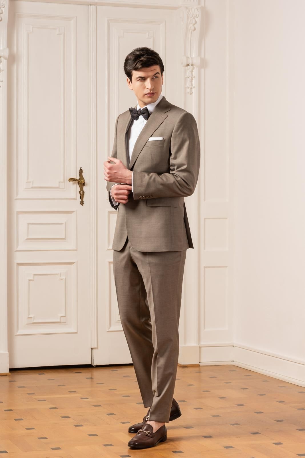 Garnitur beżowy VAN THORN Ciemnobeżowy garnitur uszyty z włoskiej tkaniny 99% wełny i 1% elastanu od Reda1865 i gramaturze 270g/m2 to doskonały wybór jako codzienny garnitur w ramach obowiązków zawodowych. Dzięki nowoczesnej technologii tkania włókien gwarantuje on sportowy komfort i dynamikę …