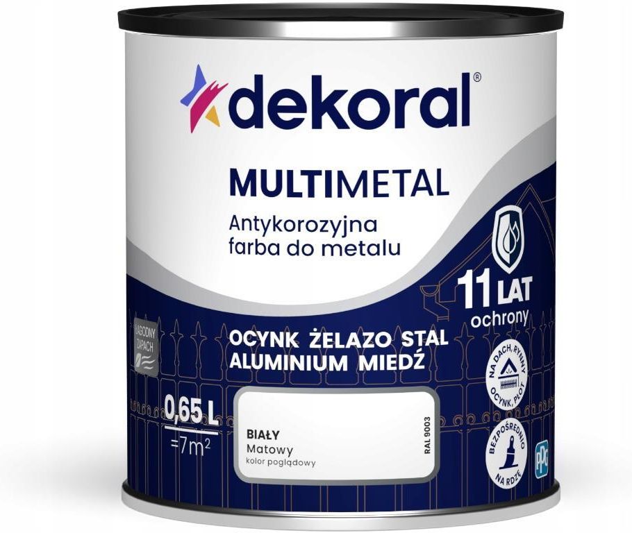 DEKORAL MULTIMETAL Przedmiotem aukcji sklepu "KLEKS NA ŚCIANIE" jest: DEKORAL MULTIMETAL 0,65L BIAŁY MAT Wygląd powłoki: mat Ilość warstw: 2-3 Nanoszenie drugiej warstwy: po 4h Sposób nanoszenia: Wałek, Natrysk, Pędzel Wydajność przy jednej warstwie: do 11m2/L ZAKRES STOSOWANIA Antykorozyjna farba …