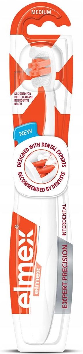Szczoteczka Interdental Expert Precision – ŚREDNIA Szczególnie narażone na próchnicę są miejsca, gdzie nie dociera zwykła szczoteczka Szczoteczka do zębów elmex Interdental Expert Precision została stworzona z myślą o precyzyjnym i dokładnym docieraniu do przestrzeni międzyzębowych i usuwaniu płytki bakteryjnej. Szczoteczka międzyzębowa czyści delikatnie i skutecznie. Wypróbuj szczoteczkę elmex Interdental Expert Precision dla dokładnego czyszczenia przestrzeni międzyzębowych. Włókna tej dokładnie czyszczącej szczoteczki zostały zaprojektowane w kształt X, zapewniając dokładne dotarcie do przestrzeni międzyzębowych jednocześnie skutecznie czyszcząc powierzchnię zębów. Dodatkowo, włókna tej szczoteczki są ułożone na rożnych wysokościach i kątach, dzięki czemu docierają głęboko między zęby, aby usuwać płytkę bakteryjną. Gęsto ułożone włosie z ponad 4500 włóknami zapewnia skuteczne, ale delikatne czyszczenie. Ergonomiczna rączka szczoteczki jest wygodna w użytkowaniu. Naukowo przetestowana i opracowana we współpracy z ekspertami stomatologicznymi. Szczoteczka elmex Interdental Expert Precision 1. Stworzona dla dokładnego czyszczenia przestrzeni międzyzębowych. 2. Dociera do głębokich przestrzeni międzyzębowych, aby usunąć płytkę bakteryjną. 3. Czyści skutecznie, ale delikatnie. 4. Wykonana w 40% z plastiku pochodzącego z recyklingu. Dla zapewnienia optymalnej higieny jamy ustnej, używaj tej szczoteczki z pastą do zębów elmex Caries Professional i płynem do płukania jamy ustnej. Nowa szczoteczka czyści o 95% lepiej! Czy wiesz, że nowa szczoteczka usuwa 95% więcej płytki nazębnej spomiędzy zębów niż szczoteczka używana przez 3 miesiące? To kolejny argument za tym, by wymienić swoją starą szczoteczkę na nową elmex Interdental Expert Precision. Ale to nie wszystko. Kiedy wymienić szczoteczkę do zębów? Jest przynajmniej kilka dobrych powodów, by często i regularnie wymieniać szczoteczkę na nową: Po każdej infekcji górnych dróg oddechowych lub infekcji jamy ustnej, aby uniknąć ryzyka ponownego zakażenia. Po trzech miesiącach używania, bo na powierzchni włókien szczoteczki gromadzą się bakterie. Gdy odkształcą się włókna szczoteczki, ponieważ traci ona wówczas swoje właściwości. Prawdopodobnie najlepszy moment na wymianę Twojej starej szczoteczki do zębów już był. Drugi najlepszy jest teraz. Wypróbuj też inne produkty elmex dopasowane do Twoich potrzeb elmex® to jedna z najbardziej znanych marek w kategorii higieny jamy ustnej w Europie. Stworzona w Szwajcarii, od 1948 roku promuje profilaktykę stomatologiczną, oferując szeroką gamę produktów o klinicznie potwierdzonej skuteczności. Poszczególne produkty elmex, zwłaszcza stosowanie łącznie, zapewniają skuteczną ochronę przed próchnicą oraz innymi problemami jamy ustnej: ● pasty do zębów ● szczoteczki do zębów ● płyny do płukania jamy ustnej ● nici dentystyczne