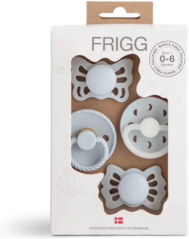 FRIGG Baby's First Pacifier​ Moonlight Sailing, 4 szt., Smoczki dla dzieci, Postaw na sprawdzony sposób na pocieszenie swojego dziecka. Smoczek FRIGG Baby's First Pacifier​ Moonlight Sailing sprawi, że Twoje dziecko natychmiast poczuje się bezpiecznie. Smoczek szybko stanie się ważnym i przydatnym elementem każdego dnia, które spędzasz z dzieckiem. Właściwości: wspomaga prawidłowy rozwój dziąseł i zębów dopasowuje się do kształtu podniebienia dziecka zapewnia optymalny przepływ powietrza miękki materiał ortodontyczny kształt umożliwia swobodne oddychanie przez nos i przełykanie śliny nie zaburza odruchu ssania Zawartość zestawu: FRIGG Lucky Powder Blue smoczek 1 szt. FRIGG Rope Powder Blue smoczek 1 szt. FRIGG Moon Phase Night Powder Blue smoczek 1 szt. FRIGG Butterfly smoczek 1 szt. Skład: kauczuk silikon Sposób użycia: Zawsze używaj smoczka w rozmiarze odpowiednim dla wieku dziecka.