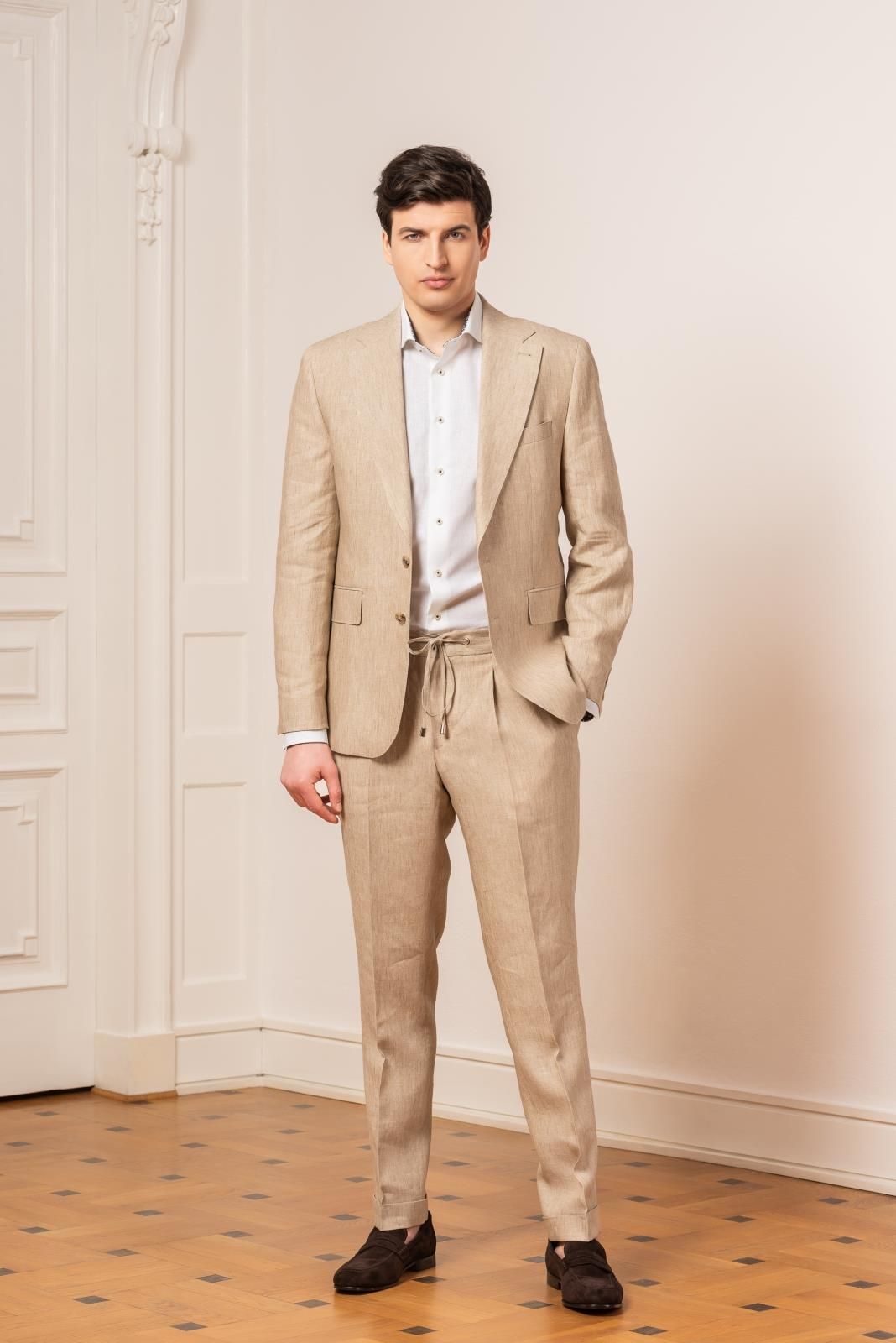 Lniany garnitur VAN THORN Dla poszukujących typowo wakacyjnego, lekkiego i przewiewnego garnituru na nieformalne okazje VAN THORN przygotował beżowy, lniany garnitur. Klasyczna marynarka zapinana na dwa guziki, z otwartymi klapami w połączeniu ze sportowym krojem spodni wiązanych w pasie naturalnie wpiszą się w luźne, skąpane w słońcu spotkania towarzyskie lub wyjazdy wakacyjne. Garnitur na ślub plenerowy Ze względu na niższy poziom formalności wynikający z otoczenia lniany garnitur fantastycznie wpisuje się w stylistykę ślubu plenerowego. Ślub boho na plaży? Bez butów, pod zwiewnym zadaszeniem? A może mała leśniczówka i leśna polana? Z mchem pod stopami i błękitnym niebem nad głową. W takich okolicznościach beżowy lniany garnitur będzie prezentował się olśniewająco na Panu Młodym. Idealny garnitur na lato Oczywiście każdy zdaje sobie sprawę z gniotliwego charakteru lnianych tkanin. Jednak w okresie letnim można to sobie wybaczyć, ponieważ dzięki swojej przewiewności lniana tkanina gwarantuje komfort trudny do osiągnięcia dla innych materiałów. Naturalnie wysoka absorbcja wilgoci przez len oraz jego właściwości antybakteryjne gwarantują komfort i casualową elegancję przez cały czas. A nieformalny charakter spodni i klasyczny krój marynarki ułatwiają łatwe dekompletowanie tego zestawu w zależności od potrzeb, co nadaje lnianemu garniturowi niezwykle szeroką gamę zastosowań. Jak stylizować lniany garnitur Zgodnie z charakterem tkaniny oraz jej kolorem beżowy lniany garnitur nie jest propozycją na formalne okazje. Jeśli więc chcesz włożyć garnitur z lnu na ślub to zdecydowanie w konwencji bardzo luźnego wydarzenia, np. zaślubiny na plaży. Co do samego łączenia lnianego garnituru z innymi elementami garderoby fantastycznie sprawdzą się lniane lub wykonane z mieszani len-bawełna koszule w bieli, różu czy błękitach. W stylizacji lnianego garnituru najlepiej sprawdzą się wykonane ze skóry licowej loafersy lub bardziej casualowe zamszowe mokasyny. Len 270g/m W przypadku szycia na miarę w pracowniach VAN THORN na bazie przedstawionego modelu cena realizacji związana jest z dopłatą minimum 10% w zależności od indywidualnej konfiguracji.