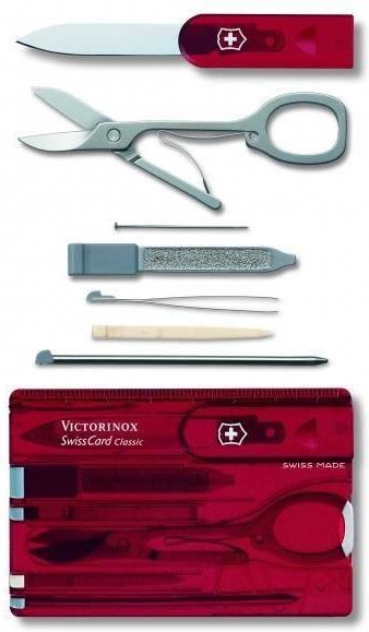 1. Nóż (również do otwierania listów) 2. Pilnik do paznokci ze 3. - Śrubokrętem 4. Nożyczki 5. Pęseta 6. Wykałaczka 7. Długopis 8. Szpilka 9. Miarka z podziałką centymetrową 10. Miarka z podziałką calową